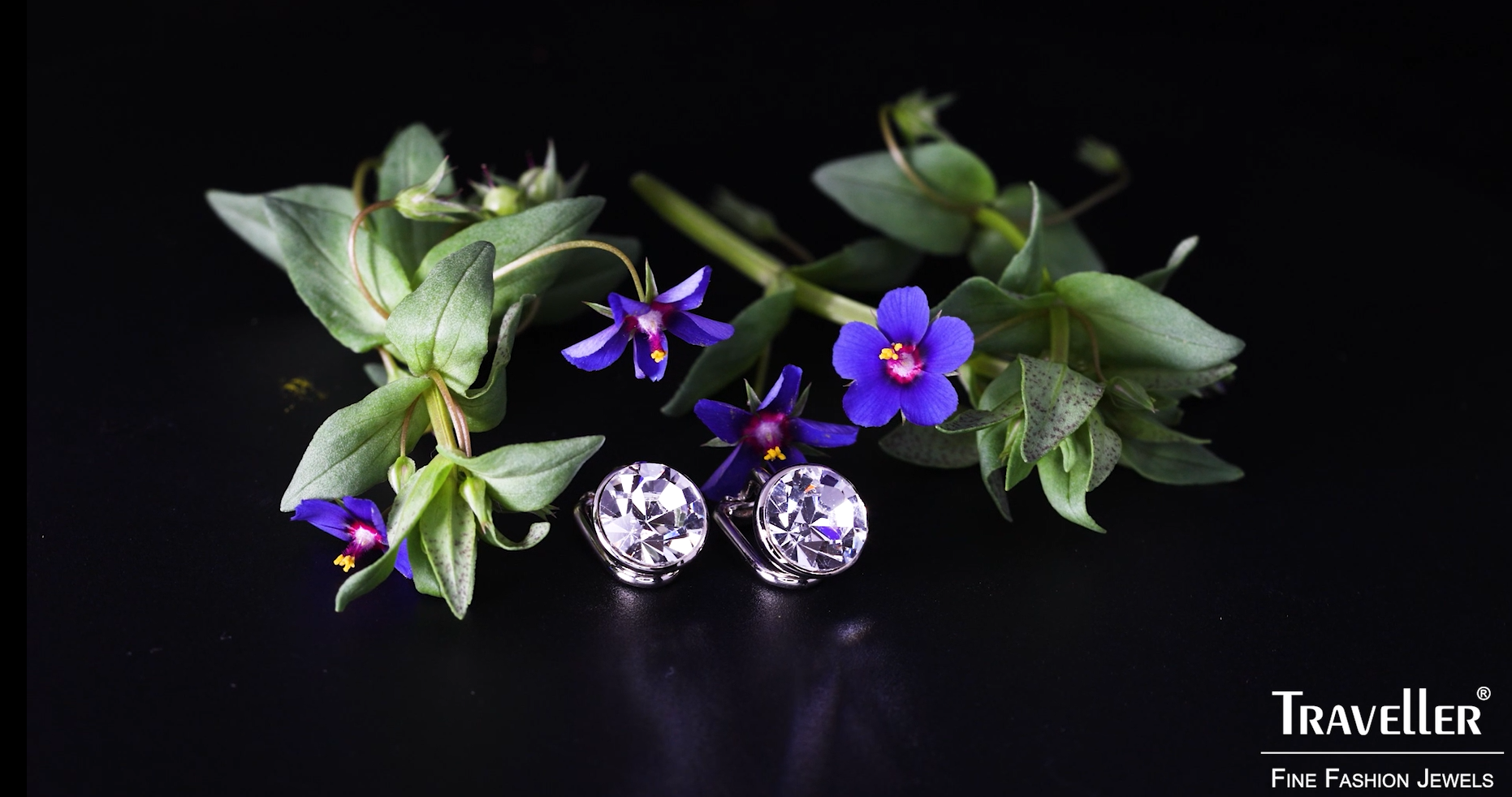 A pair of radiant clip-on earrings from Traveller. These platinum plated clip-on earrings feature a sparkling Preciosa crystal surrounded by a thin, silver-tone rim. The crystal has a diameter of 9 millimetres. The earrings weigh just 2 grams each.