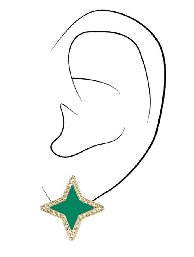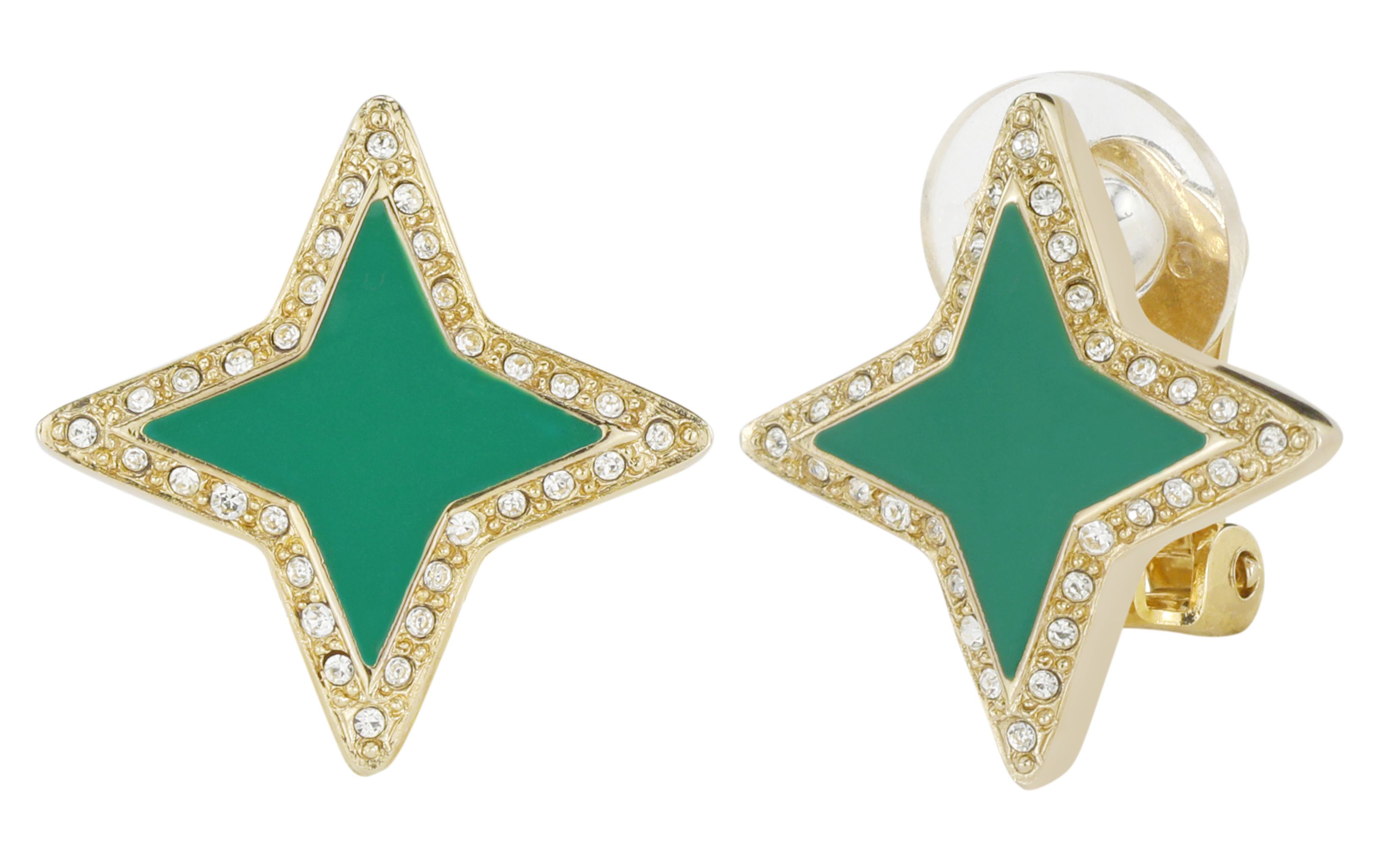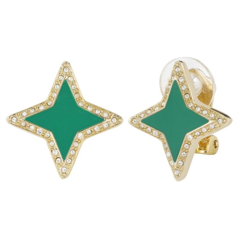 Traveller Clip-on Earrings - Star - Crystals - Green Enamel - Gold Plated - 20x20mm