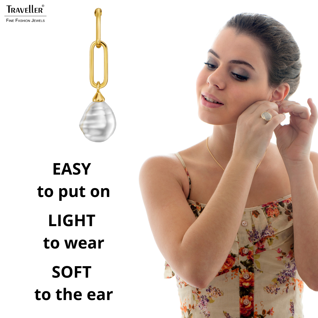 Pearls are a girls best friend.....these earrings from Traveller add an extra dimension to any outfit. Simple but well thought out; two gold plated links with a white baroque pearl attached, measuring 14 x 12 millimetres. The clip-on earrings have a total size of 50 x 12 millimetres and weigh 4.5 grams per earring. Thanks to Traveller's unique fastening system, these clip-on earrings are very comfortable, light and safe to wear.