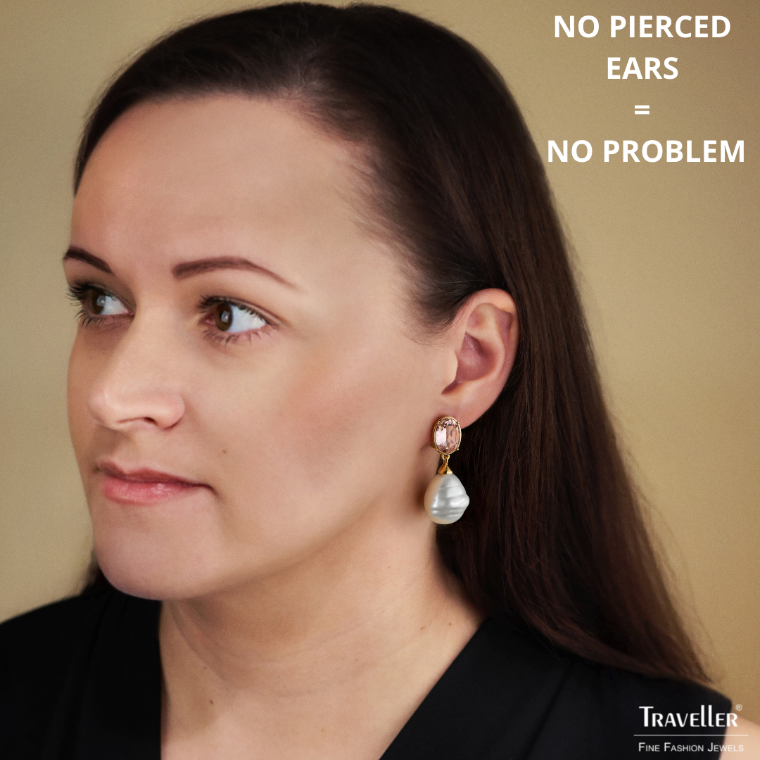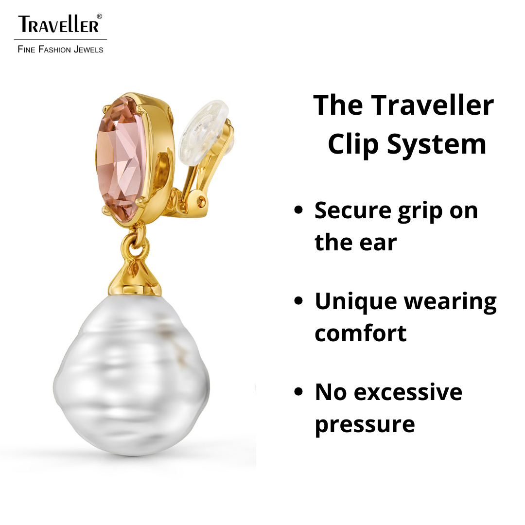 Pearls are a girls best friend and so are crystals! These beautiful clip-on earrings from Traveller have both: a beautiful large baroque pearl and a sparkling crystal. The crystal has the colour Vintage Pink and is framed with 22 carat gold plated gold. Gold plated links attach the beautiful baroque pearl measuring 20 x 17 millimetres to the crystal. The ear-clips have an overall size of 42 x 17 millimetres and weigh 11.5 grams per earring. Thanks to Traveller's unique fastening system, these ear clips are very comfortable, light and safe to wear.