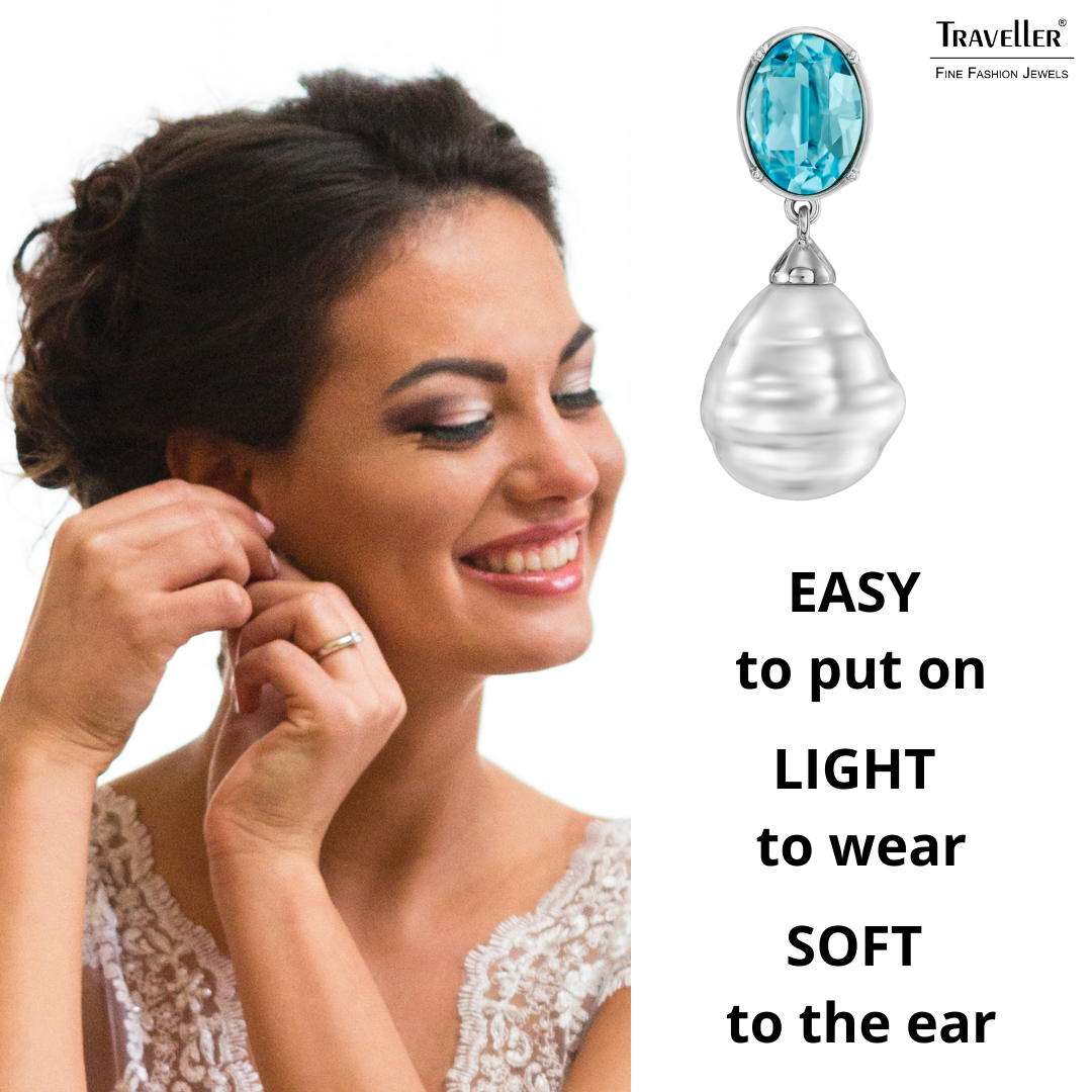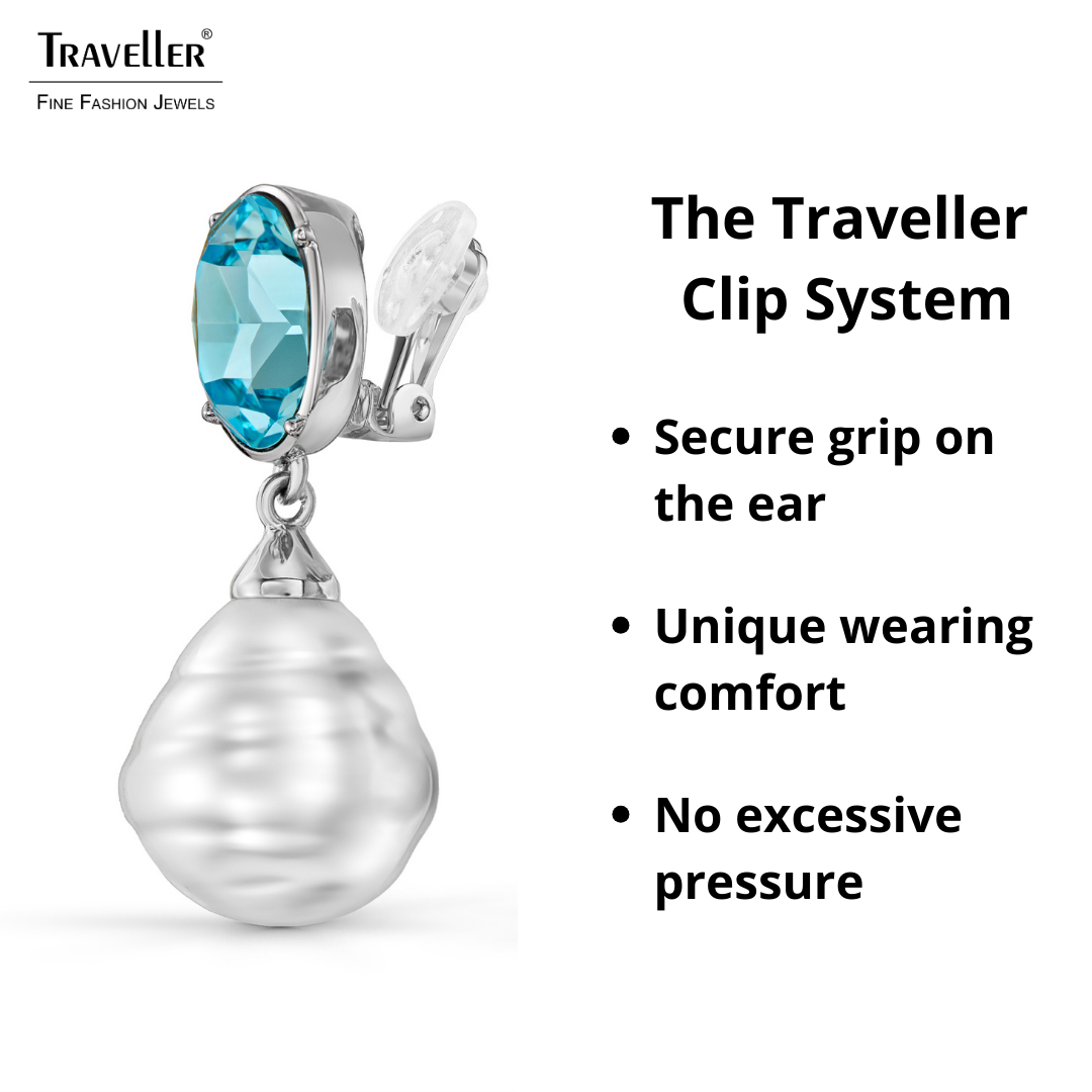 Pearls are a girls best friend and so are crystals! These beautiful clip-on earrings from Traveller have both: a beautiful large baroque pearl and a sparkling crystal. The crystal has the colour Aqua Bohemica (Blue) and is platinum plated. Platinum plated links attach the beautiful baroque pearl measuring 20 x 17 millimetres to the crystal. The ear-clips have an overall size of 42 x 17 millimetres and weigh 11.5 grams per earring. Thanks to Traveller's unique fastening system, the clip-on earrings are very comfortable, light and safe to wear.