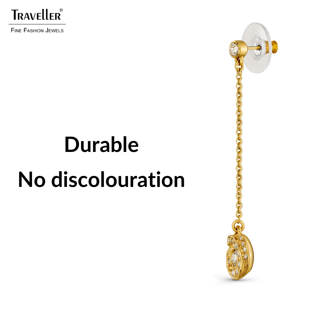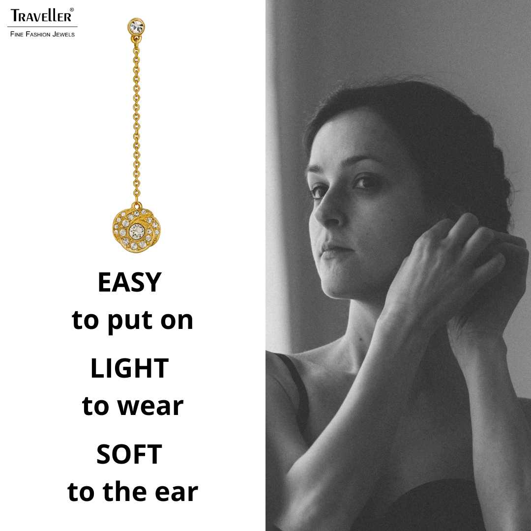 These drop earrings from Traveller are beautifully refined. The gold plated earrings consist of a Preciosa crystal as a "stud". A link string attaches the "stud" to a lotus leaf of sparkling Preciosa crystals. The earrings measure 45 x 10 and weigh 2 grams per earring.