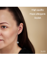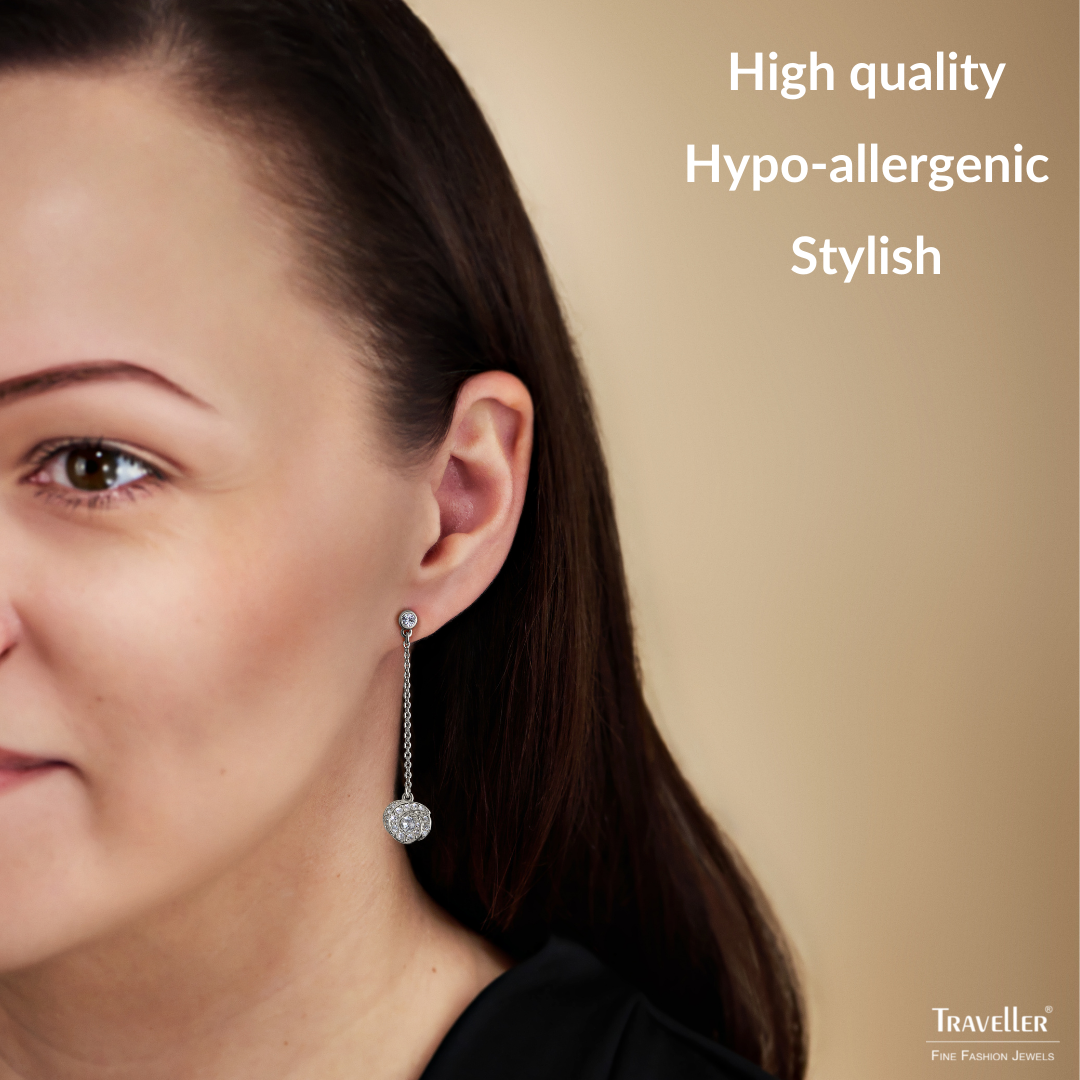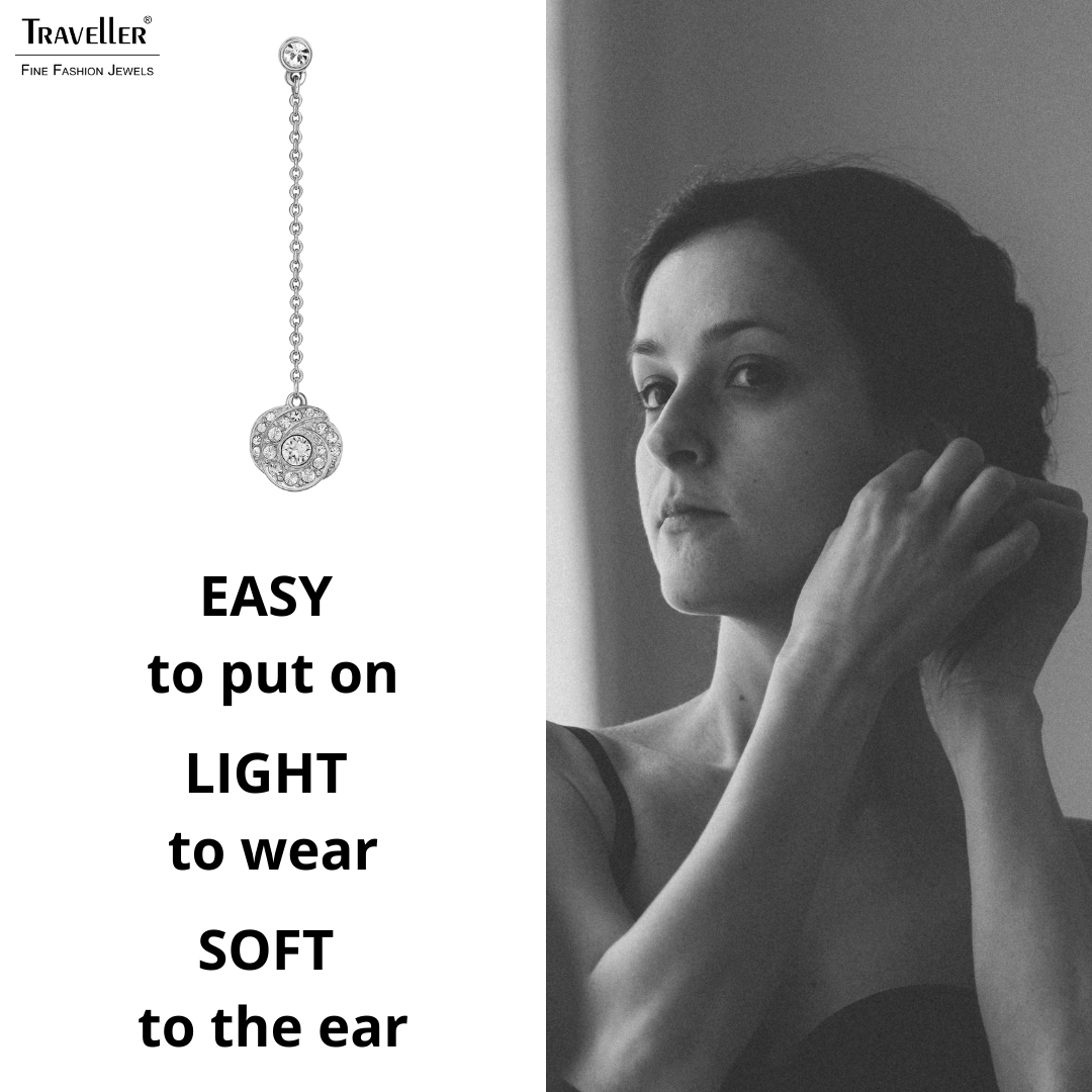 These drop earrings from Traveller are beautifully refined. The platinum plated earrings consist of a Preciosa crystal as a "stud". A link string attaches the "stud" to a lotus leaf of sparkling Preciosa crystals. The earrings measure 45 x 10 and weigh 2 grams per earring.