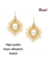 Grossé's Future Floral is a radiant jewellery line with a shiny pearl at its heart. These earrings are in the shape of futuristic flower with petals shaped like sunbeams. The earrings are fully gold plated 22 carat gold. The gold coloured drop earrings are 4.7 by 3 centimetres long and weigh 6.5 grams each.