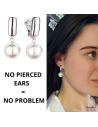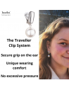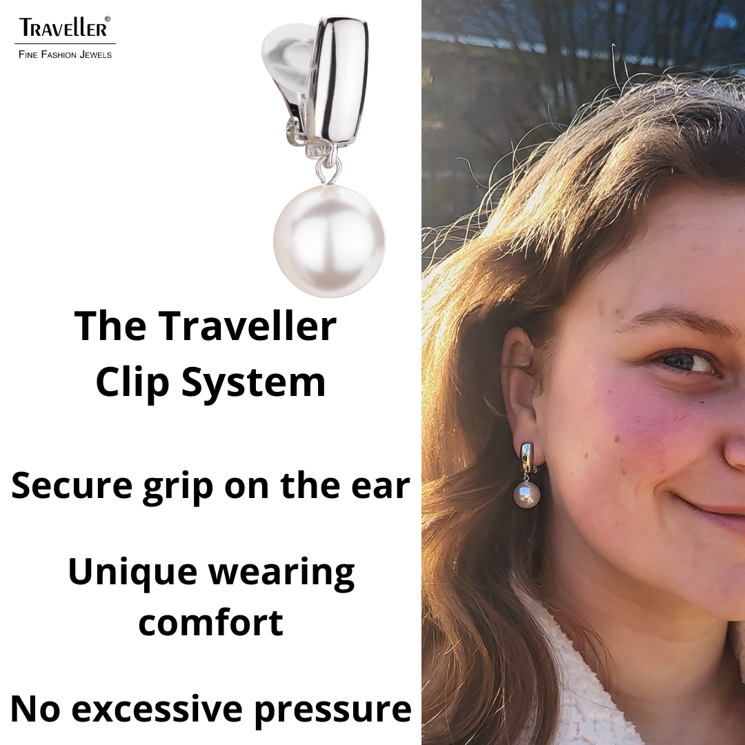These pearl clip-on earrings from Traveller exude purity, elegance and beauty. A high-quality imitation pearl from Mallorca with a diameter of 12 millimetres hangs from the platinum plated clip-on earrings (core material: metal). The ear clips measure a total of 30 x 12 millimetres and weigh 5 grams each. Thanks to Traveller's unique fastening system, these clip-ons are very comfortable, light and safe to wear.