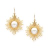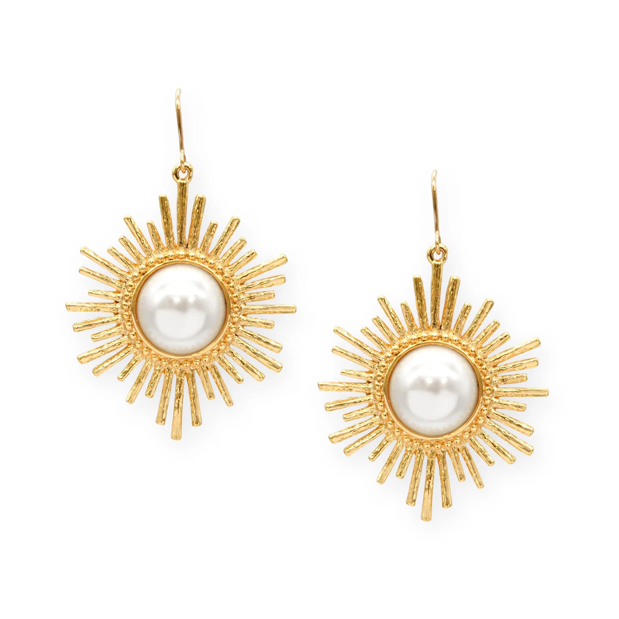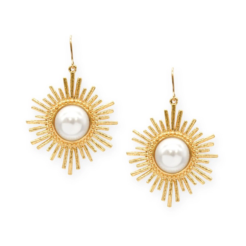 Grossé's Future Floral is a radiant jewellery line with a shiny pearl at its heart. These earrings are in the shape of futuristic flower with petals shaped like sunbeams. The earrings are fully gold plated 22 carat gold. The gold coloured drop earrings are 4.7 by 3 centimetres long and weigh 6.5 grams each.