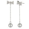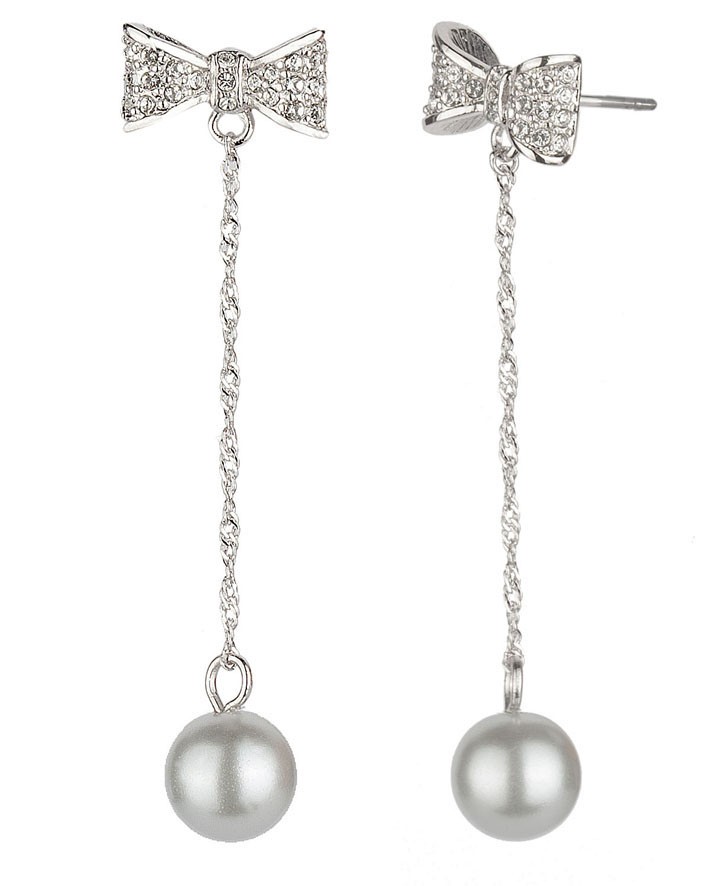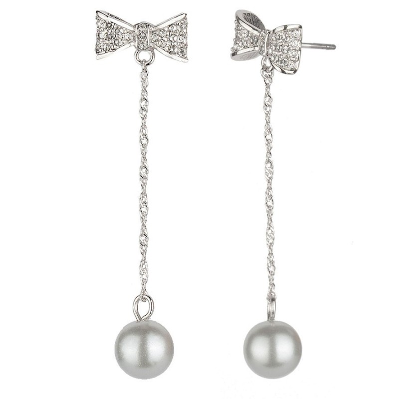 Take a bow baby! These Osira earrings consist of a rhodium plated (silver coloured) bow, set with Preciosa crystals, with a twisted rhodium plated chain underneath, from which hangs a grey pearl with a diameter of 8 millimetres. The earrings are 4.7 centimetres long and lightweight so they do not discomfort your ear.