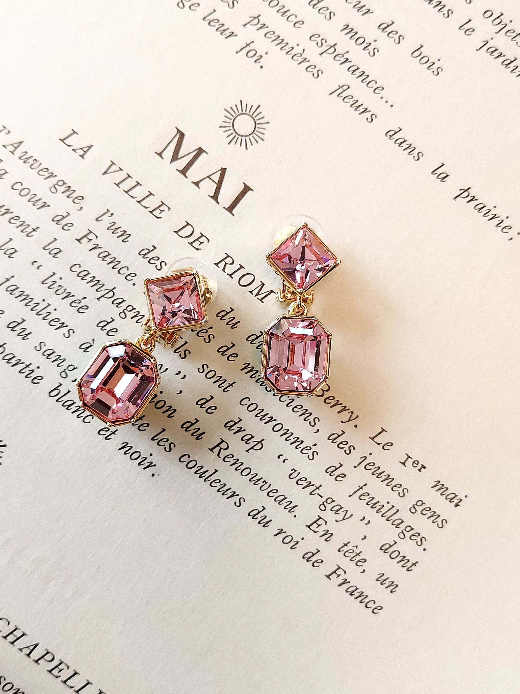 You will steal the show with these beautiful sparkling clip-on earrings from Traveller! The clip-on earrings consist of 2 shimmering light pink crystals by Preciosa, a square with an octagon underneath framed by a 22-carat gold-plated rim. The earrings are 30 millimetres long, 13 millimetres wide and weigh 6 grams per earring.