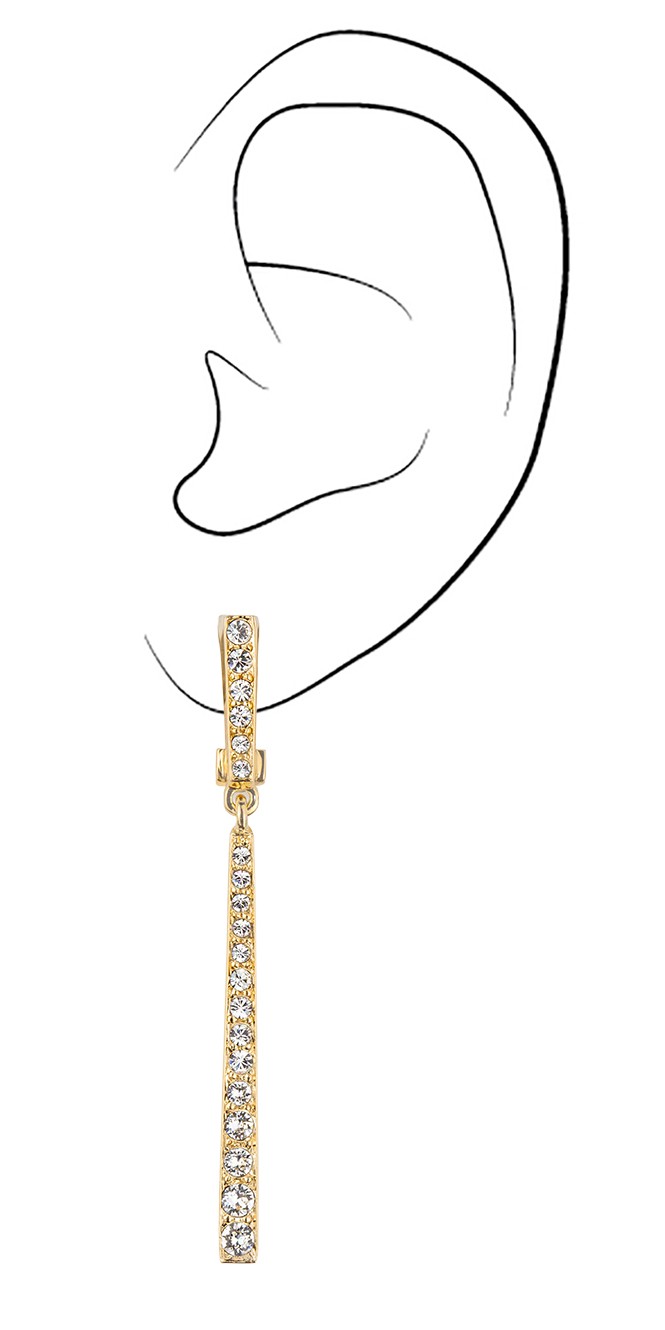 Sparkle, sparkle and shine with these clip-on earrings from Traveller. The 22ct gold plated (core material: metal) clip-on earrings consist of two pieces both studded with Preciosa crystals. A much longer piece hangs from the small piece above. In total, the ear clips are 5.5 centimetres long, each weighing 3 grams. Thanks to Traveller's unique fastening system, the clips are comfortable, light and safe to wear.