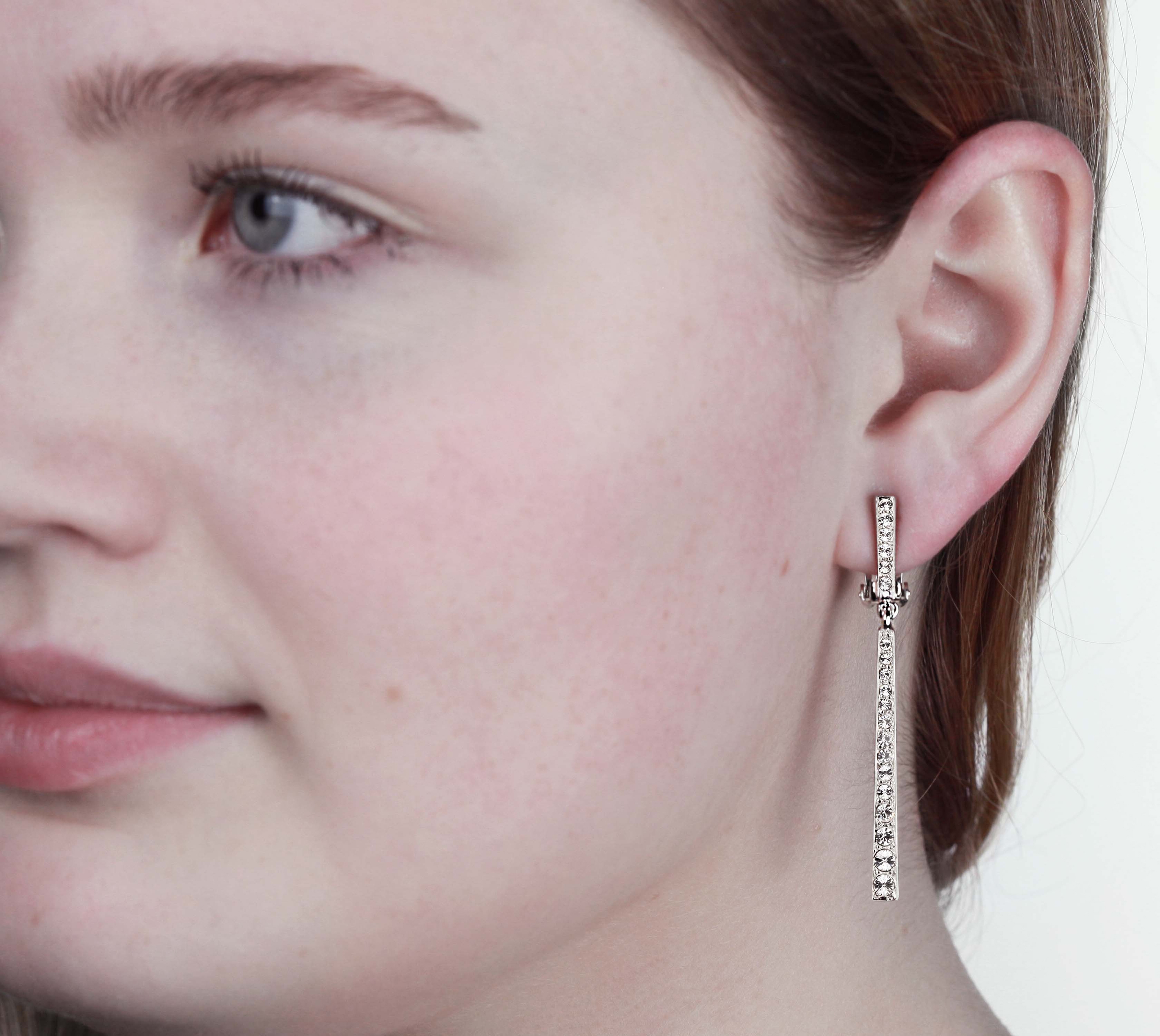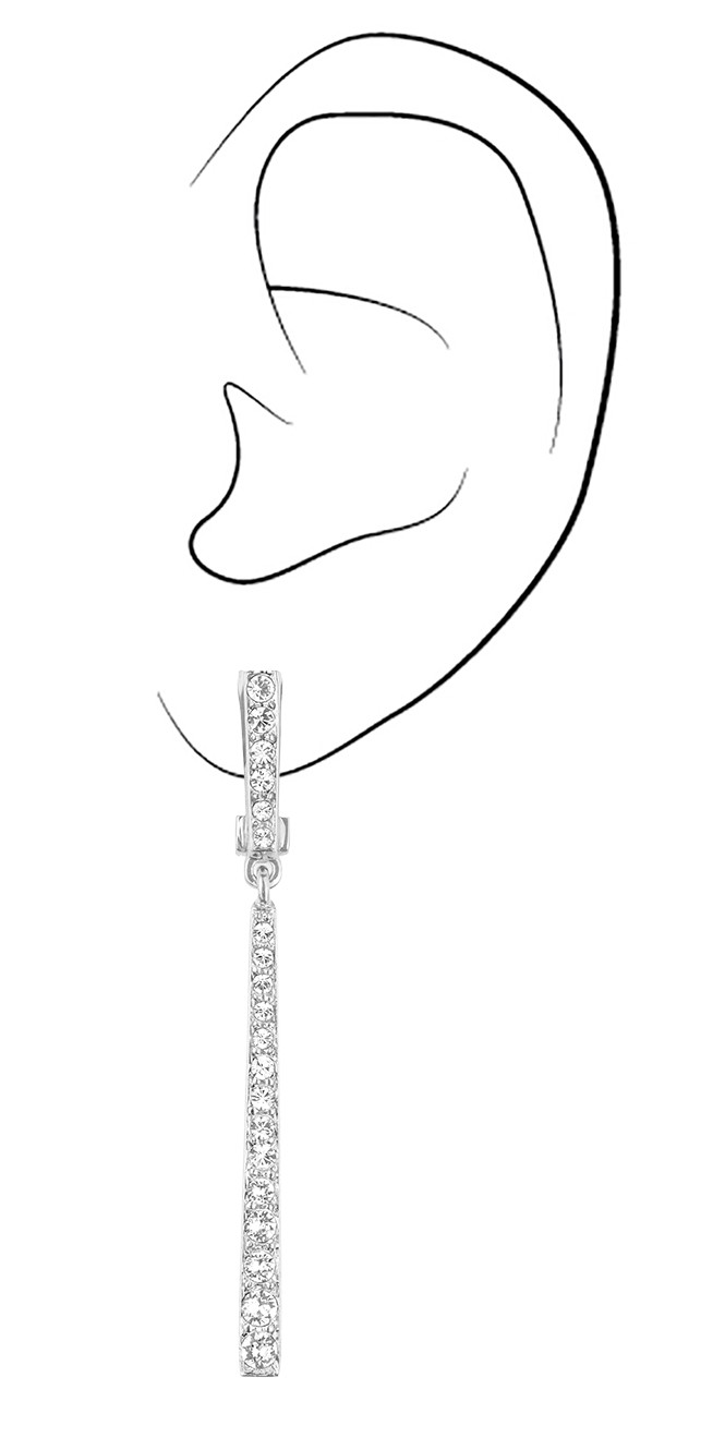 Sparkle and shine with these clip-on earrings from Traveller. The platinum plated (core material: metal) clip-on earrings consist of two pieces both studded with Preciosa crystals. A much longer piece hangs from the small piece above. In total, the ear clips are 5.5 centimetres long, each weighing 3 grams. Thanks to Traveller's unique fastening system, the clips are comfortable, light and safe to wear.