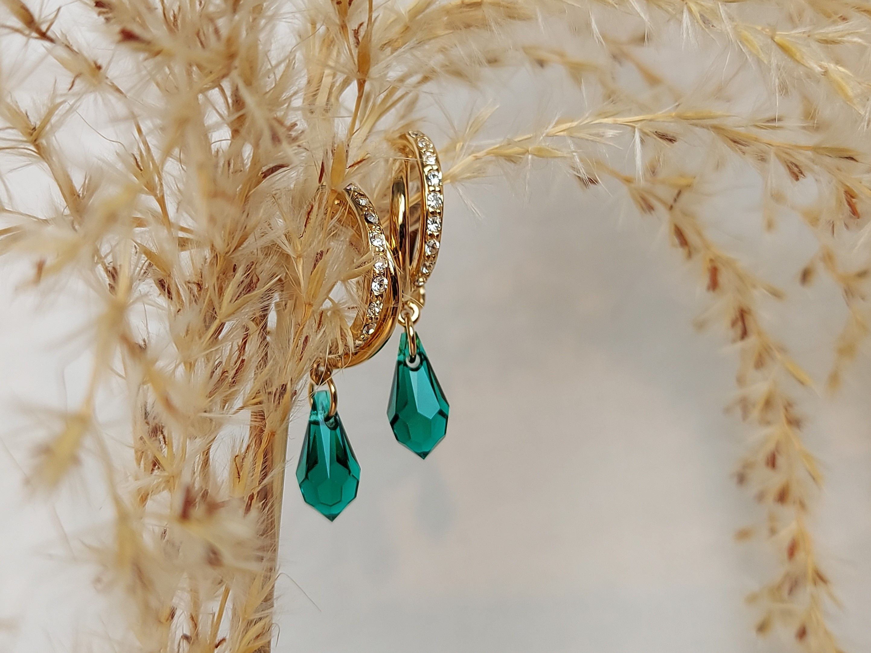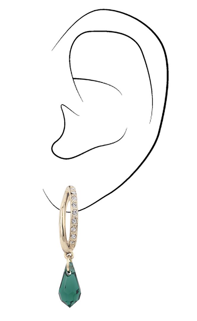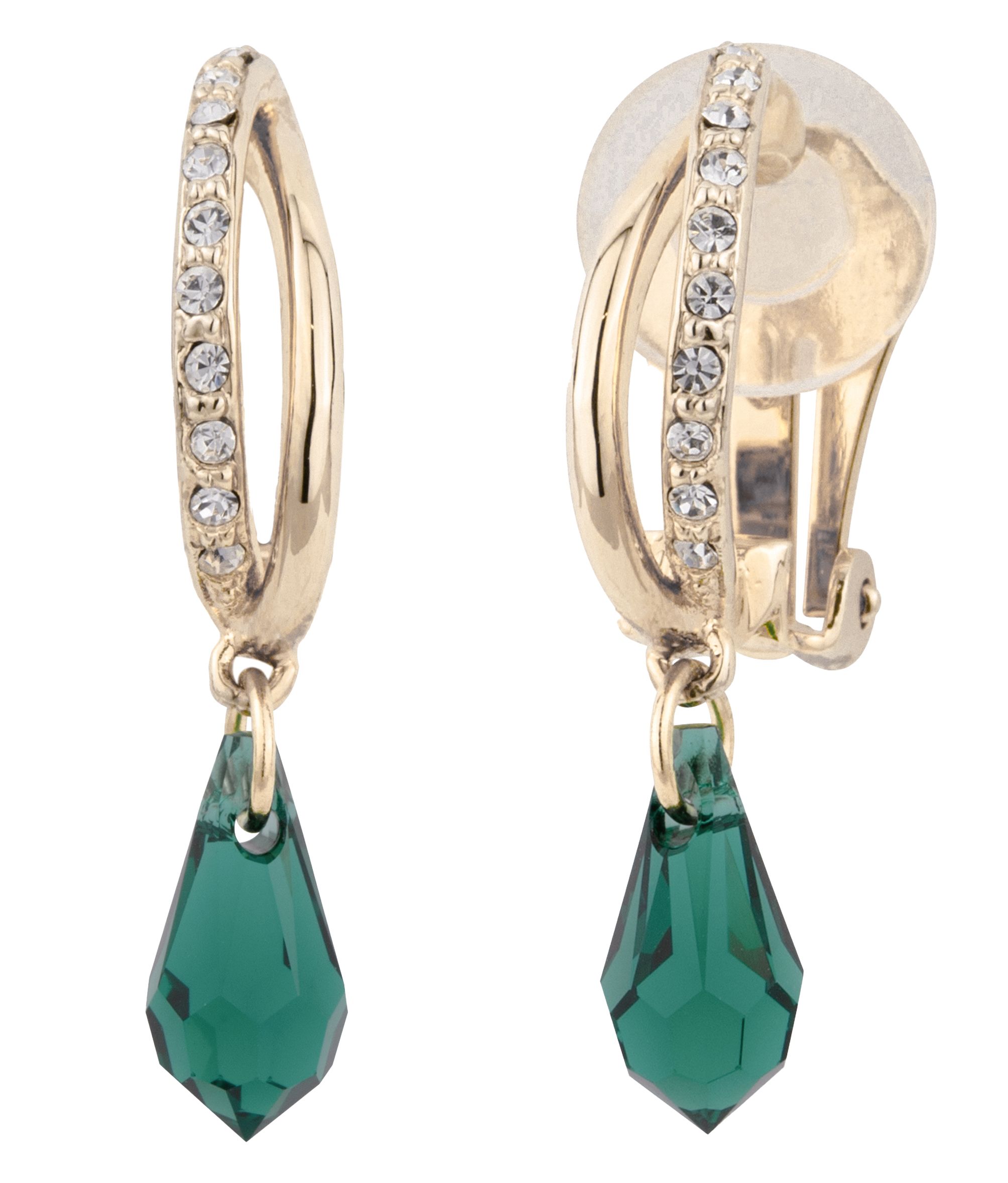 Traveller Drop Clip Earrings - God Plated - Crystals - Teardrop - Green - 30x5 mm