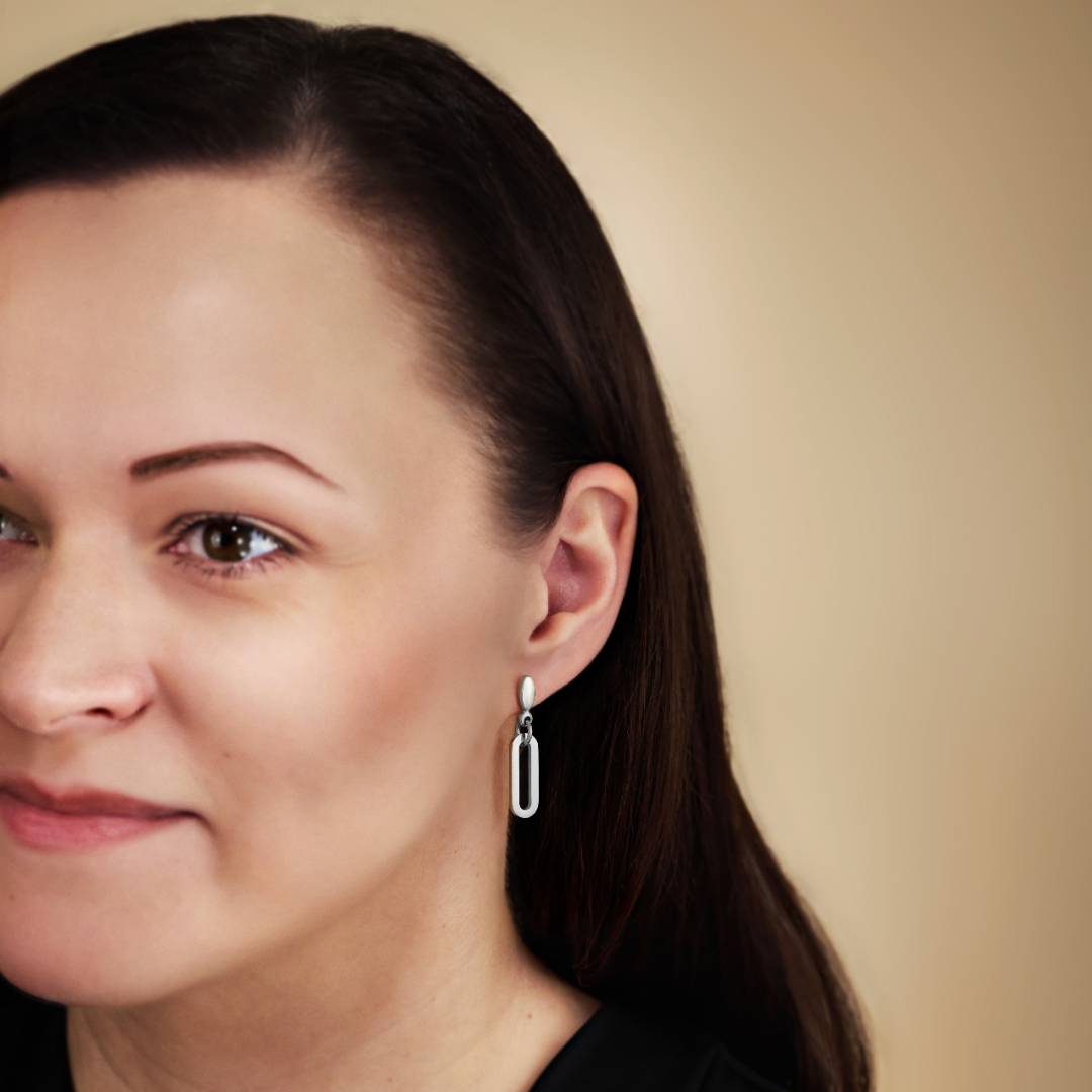 A classy design from Traveller, elegant and energetic. These silver coloured stainless steel drop earrings consist of an oval stud connected to a single link by a small ring. The earrings measure 20 x 7 millimetres and weigh 1.96 grams each.