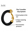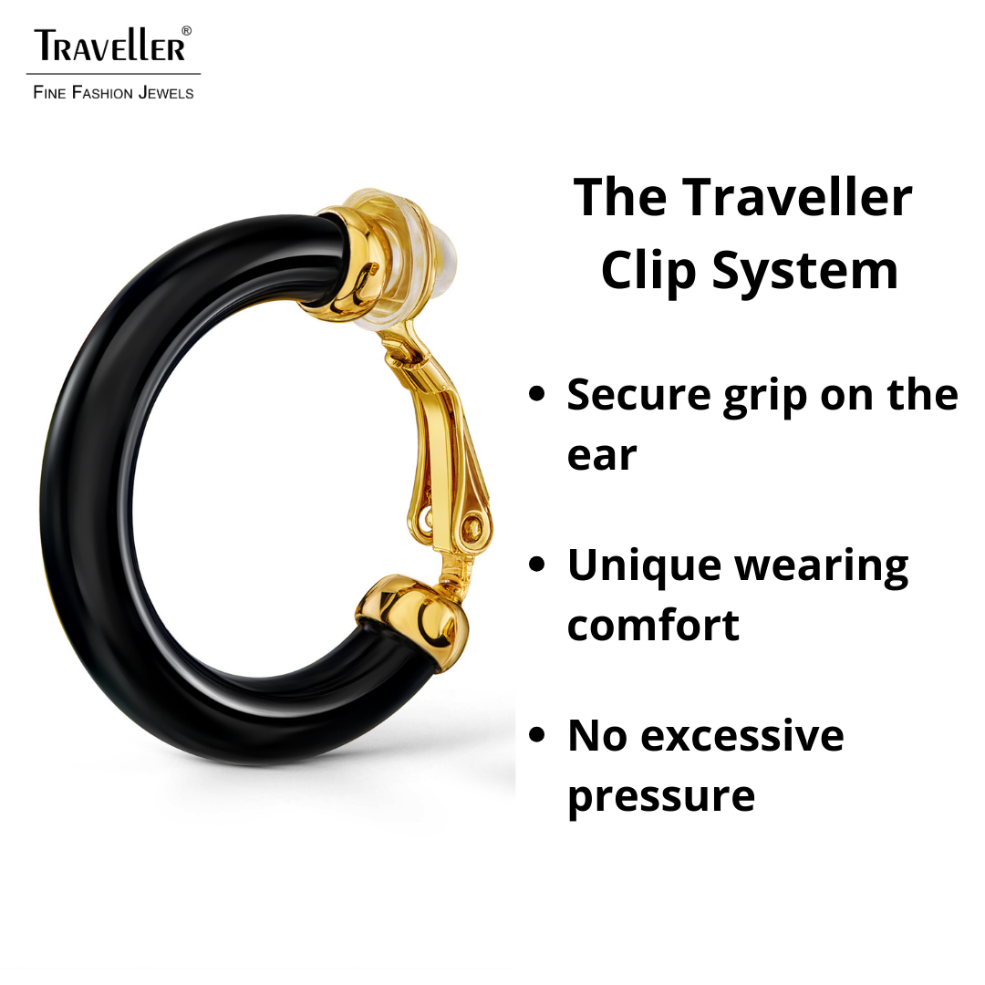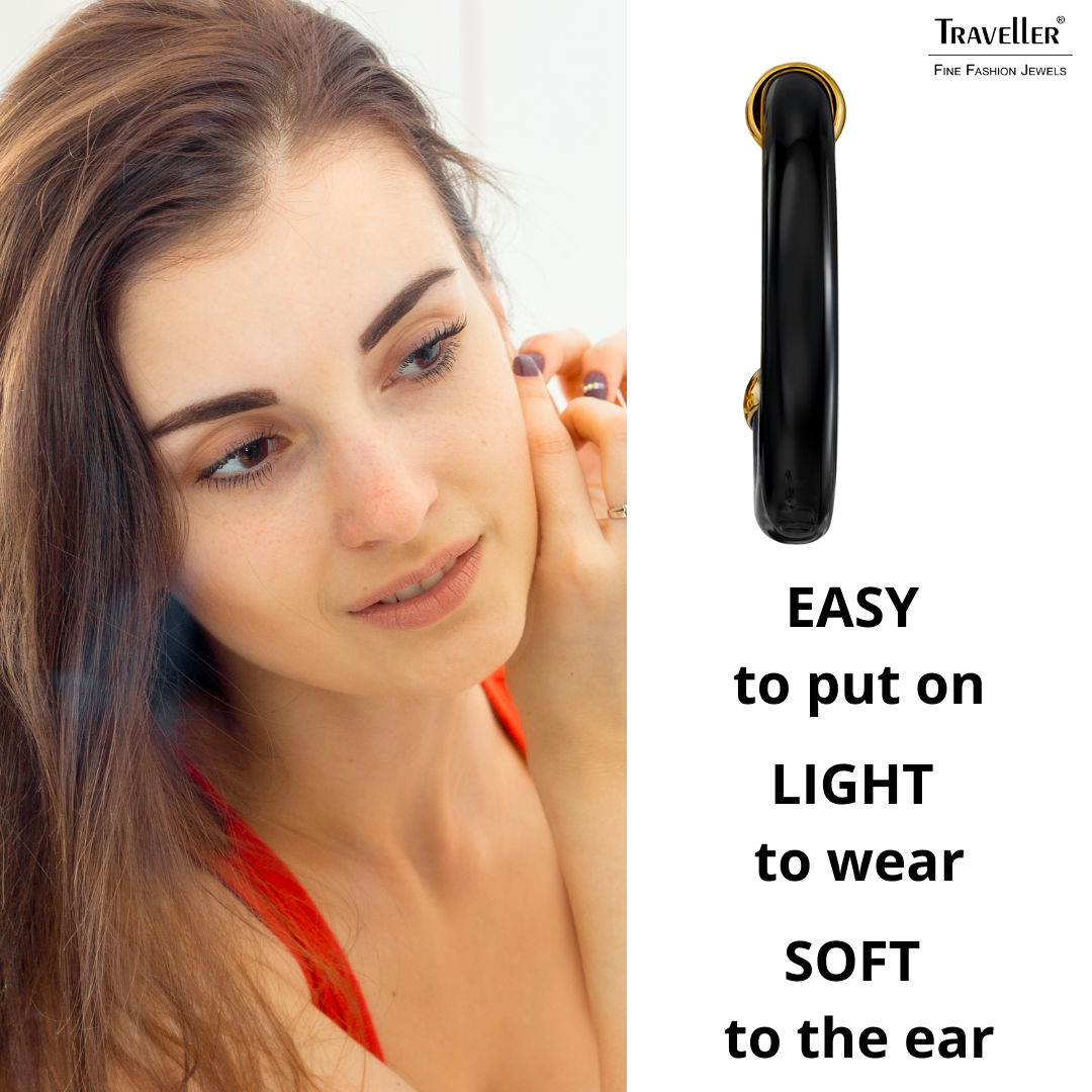 Hoops have been an icon in the fashion world for years! They are stylish, playful and match any outfit. These ear hoops from Traveller are specially designed for anyone without pierced ears. The clip-on earrings are black and the gold coloured parts are fully gold plated with 22ct gold. The earrings have a diameter of 25 millimetres, a thickness of 4 millimetres and weigh 2 grams each. Thanks to Traveller's unique fastening system, these earrings are comfortable, light and safe to wear.