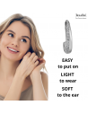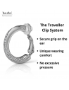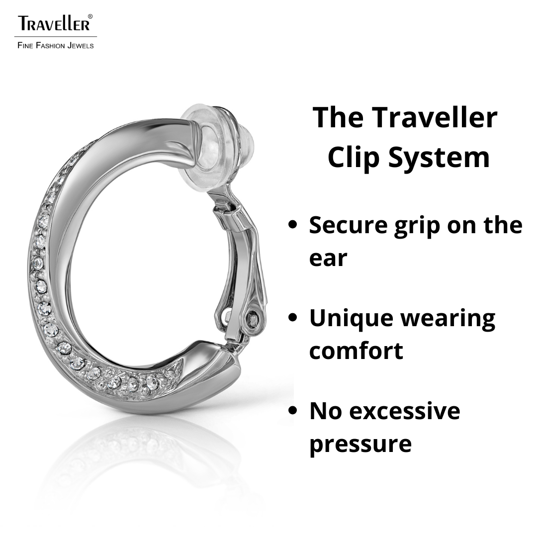 These hoop earrings from Traveller are subtle yet striking. The platinum plated clip-on earrings are shaped like a hoop, with a band of Preciosa Crystals running playfully over them. The clip-on earrings have a diameter of 20 millimetres, are 4 millimetres wide and weigh 4 grams each. Thanks to Traveller's unique fastening system, these clip-on earrings are very comfortable, light and safe to wear.