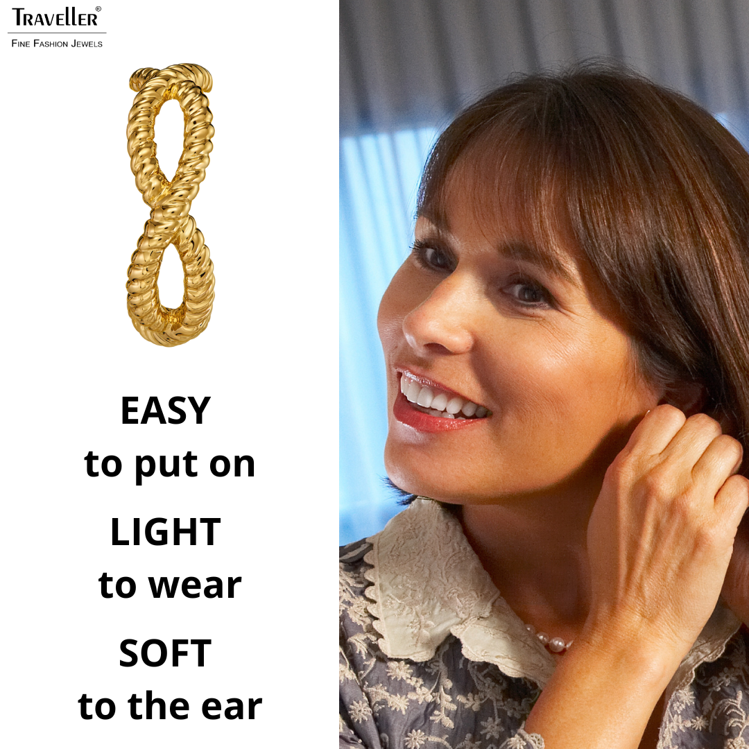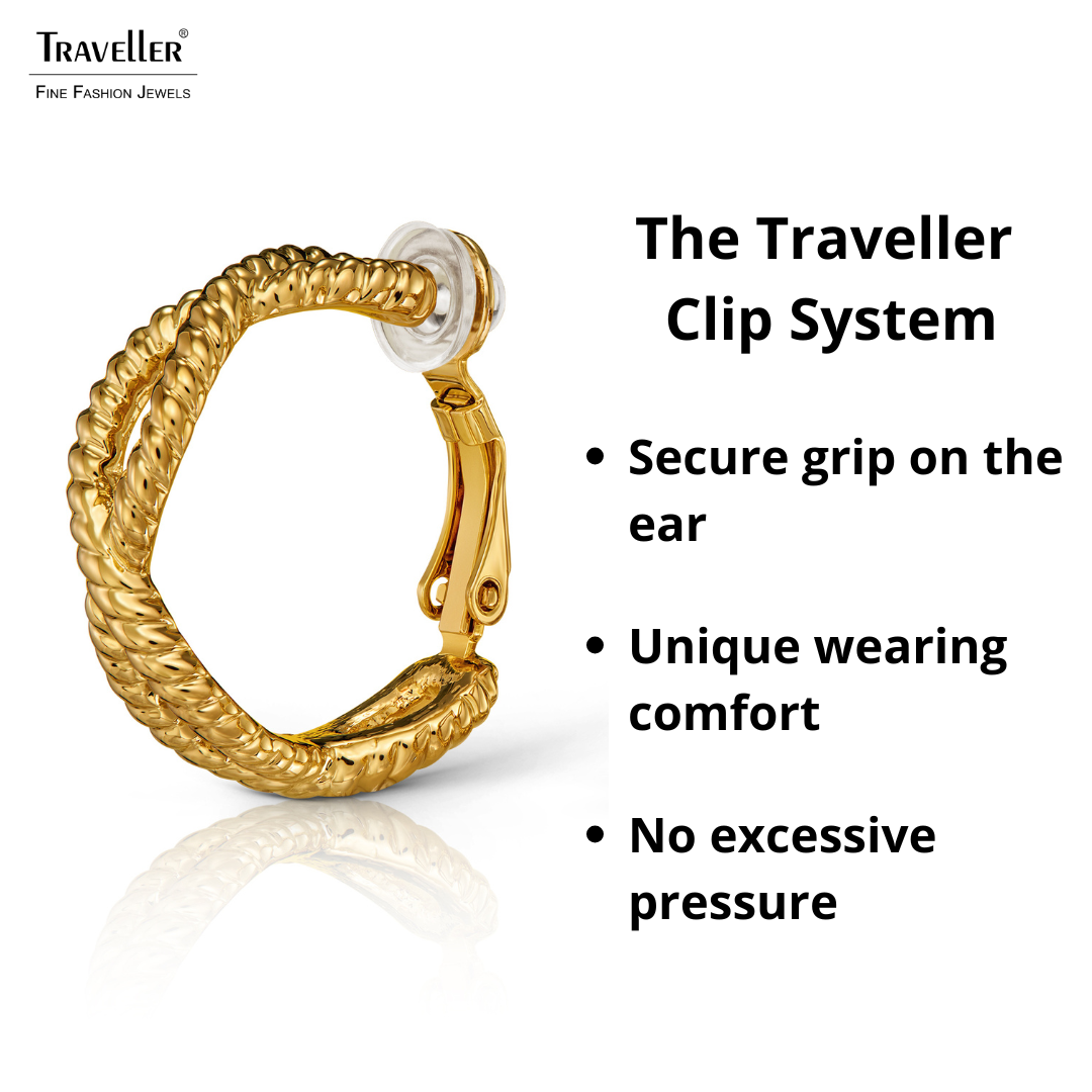 These hoop earrings from Traveller have a special design. The gold plated clip-on earrings are shaped like a hoop earring. Gold coloured strands appear braided in an openwork pattern. The clip-on earrings have a diameter of 24 millimetres, are 8 millimetres wide and weigh 3.5 grams each. Thanks to Traveller's unique fastening system, these ear clips are very comfortable, light and safe to wear.