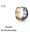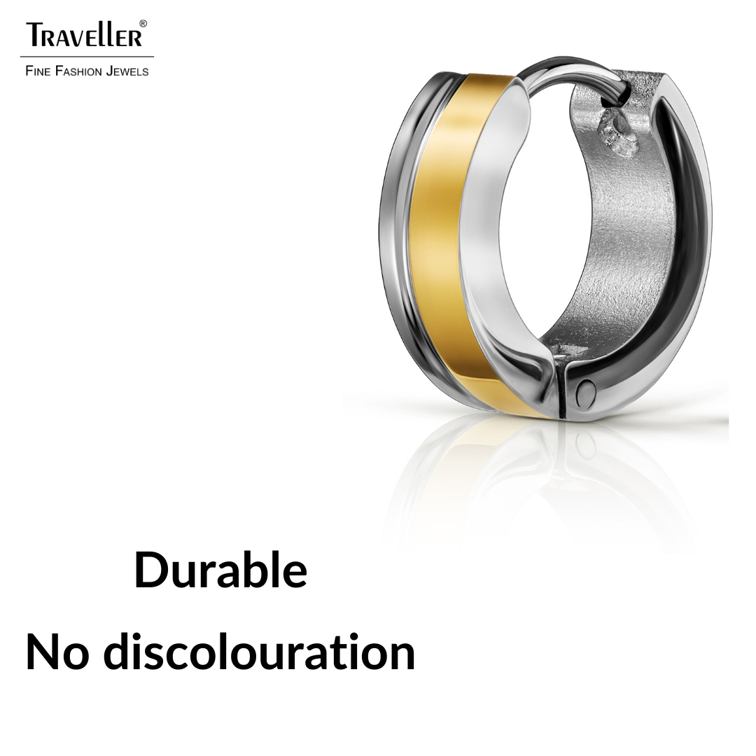 A chic, timeless pair of earrings from Traveller. These hoop earrings are made entirely of stainless steel with a gold plated (gold coloured) band on the cheek side. The earrings have a diameter of 13 millimetres and are 4 millimetres wide. Per piece, the earrings weigh just 2 grams.