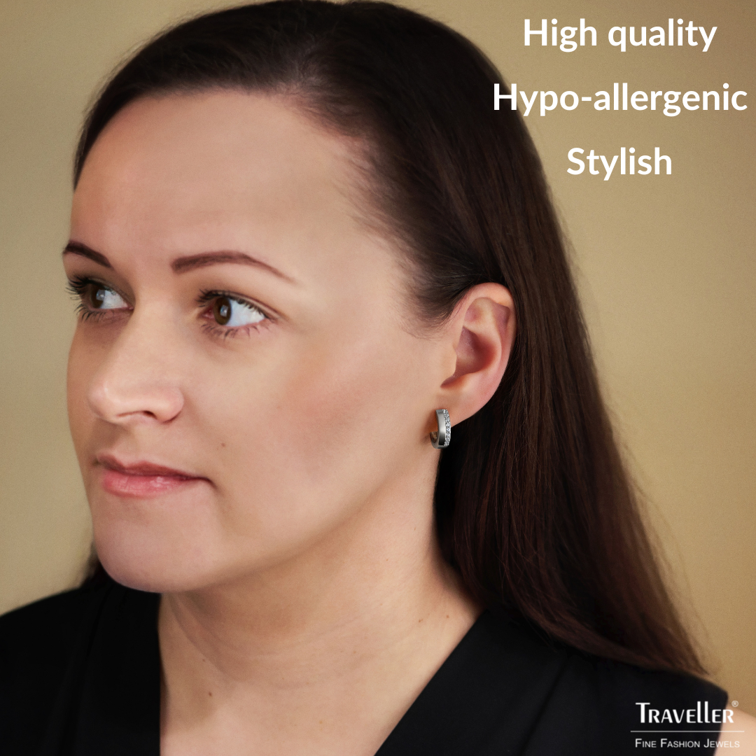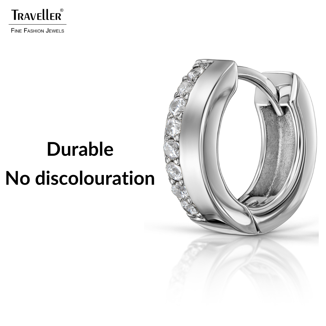 Radiate with this pair of chic, timeless earrings from Traveller. These silver coloured earrings are made entirely of stainless steel. On the outside, a rim of sparkling zirconia from Preciosa Crystals shimmers. The earrings have a diameter of 16 millimetres and are 5 millimetres wide. Per piece, the earrings weigh just 2 grams.