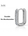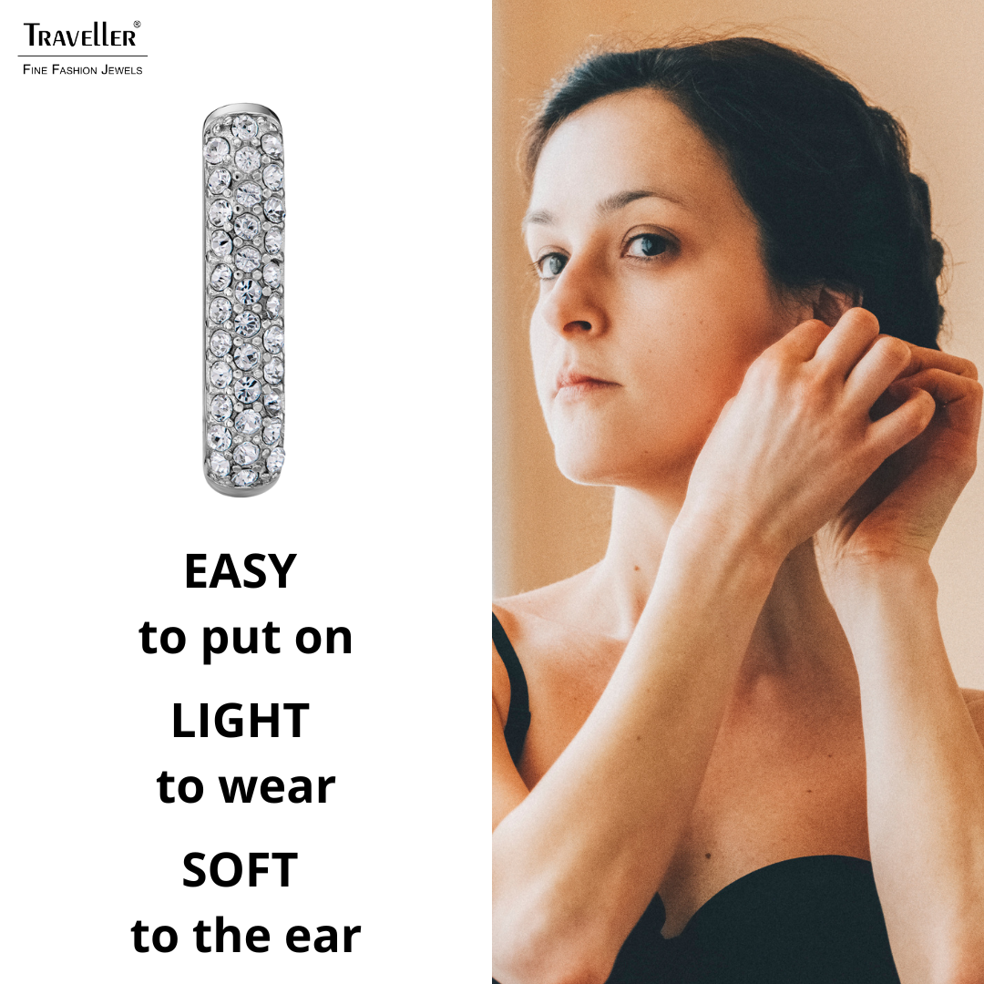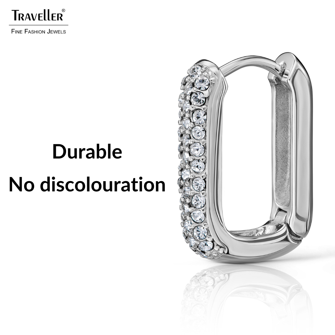 Beautifully radiant semi-classic earrings from Traveller. These silver-tone earrings are shaped like a rounded square, the front part of which is studded with crystals by Preciosa Crystals in 3 neat rows. A real eye-catcher in other words! The stainless steel earrings measure 20 x 14 millimetres and weigh just 1.25 grams each. Moreover, the hinge system ensures that the earrings are stable and comfortable to wear.