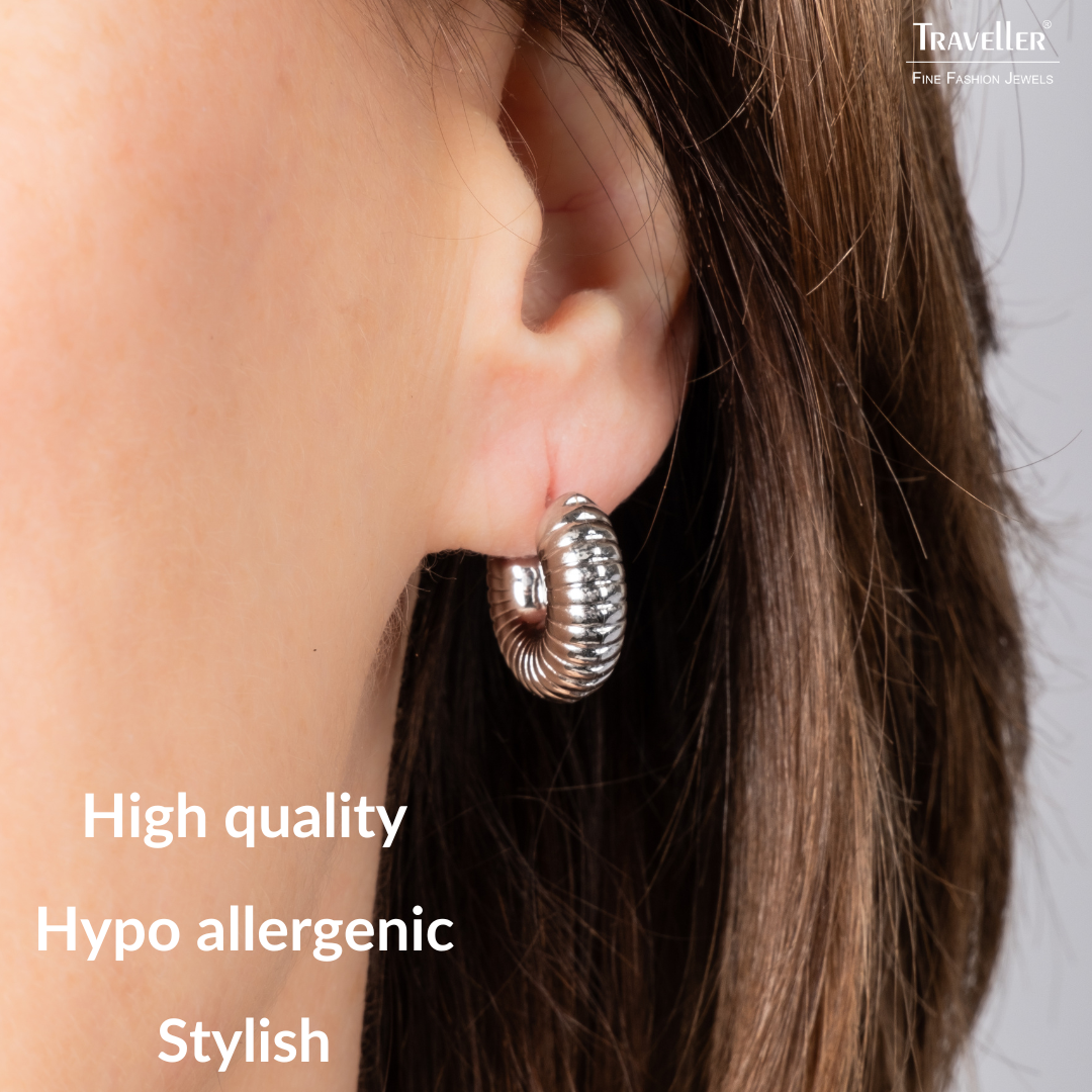 These classy earrings from Traveller have a timeless yet striking design. The earrings resemble a geometric shell, giving them a refined yet distinctive look. The earrings have a diameter of 18 millimetres and are 6 millimetres wide. Per piece, the silver coloured stainless steel earrings weigh just 2 grams.