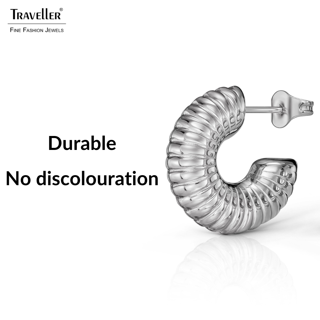 Traveller Earrings - Hoop Earrings - Silver Coloured - 3/4 Hoop - Ribbed - Stainless Steel - 18 x 6 mm - 181278