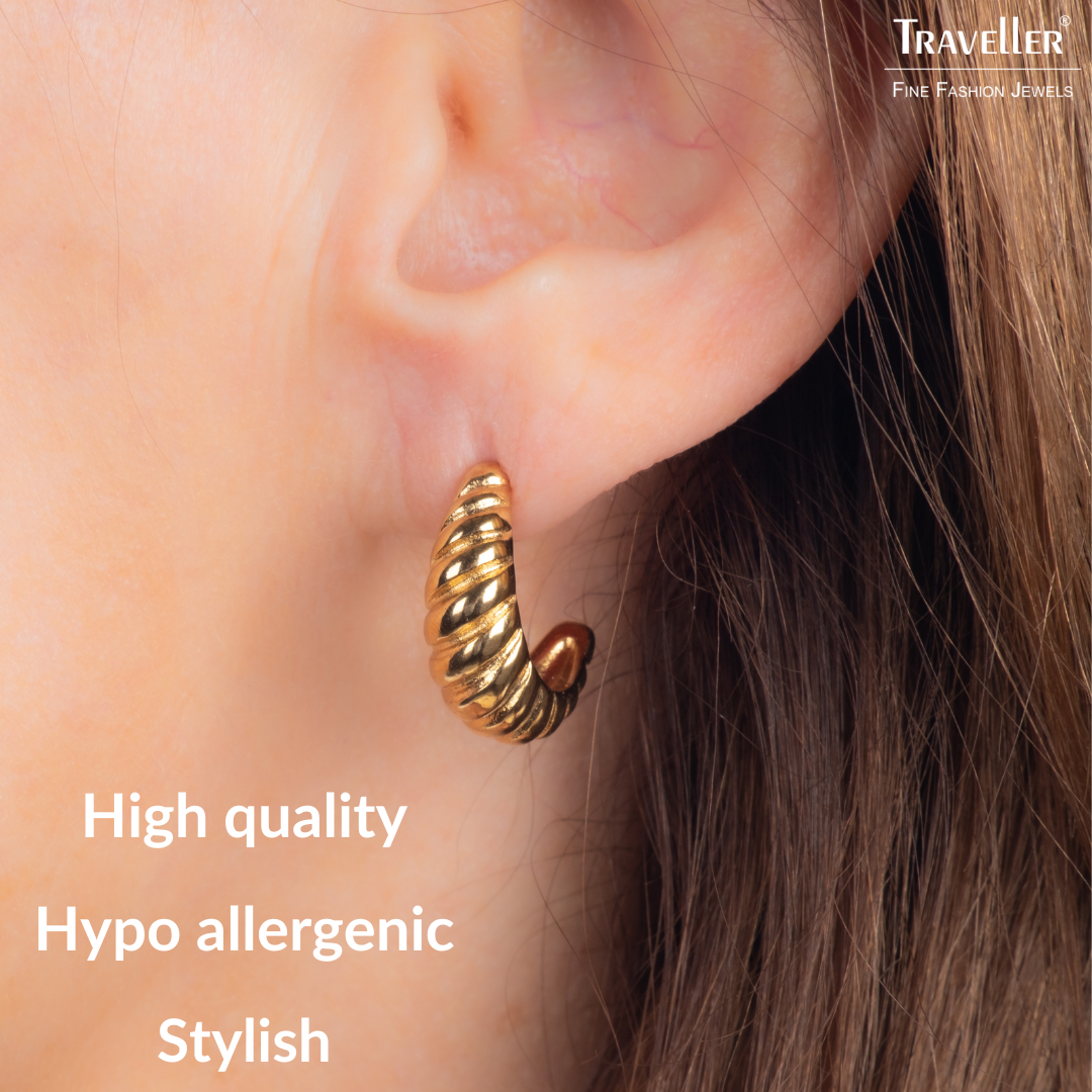 These chic earrings from Traveller have a timeless yet distinctive design. The earrings resemble a horn, giving them a salient and also elegant look. Measuring 21 x 7 millimetres, the gold coloured stainless steel earrings weigh just 2.5 grams each.