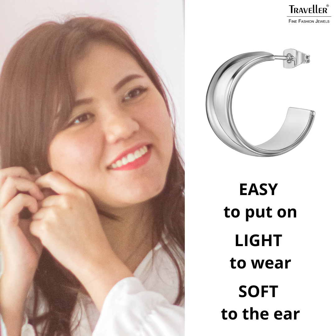 These shiny silver coloured hoop earrings from Traveller have a contemporary look. Hoop earrings have always been in fashion, and this wide version is a beautiful alternative to the classic hoop earring. The palladium plated earrings have a diameter of 22 millimetres, a width of 11 millimetres and weigh 7.3 grams each.