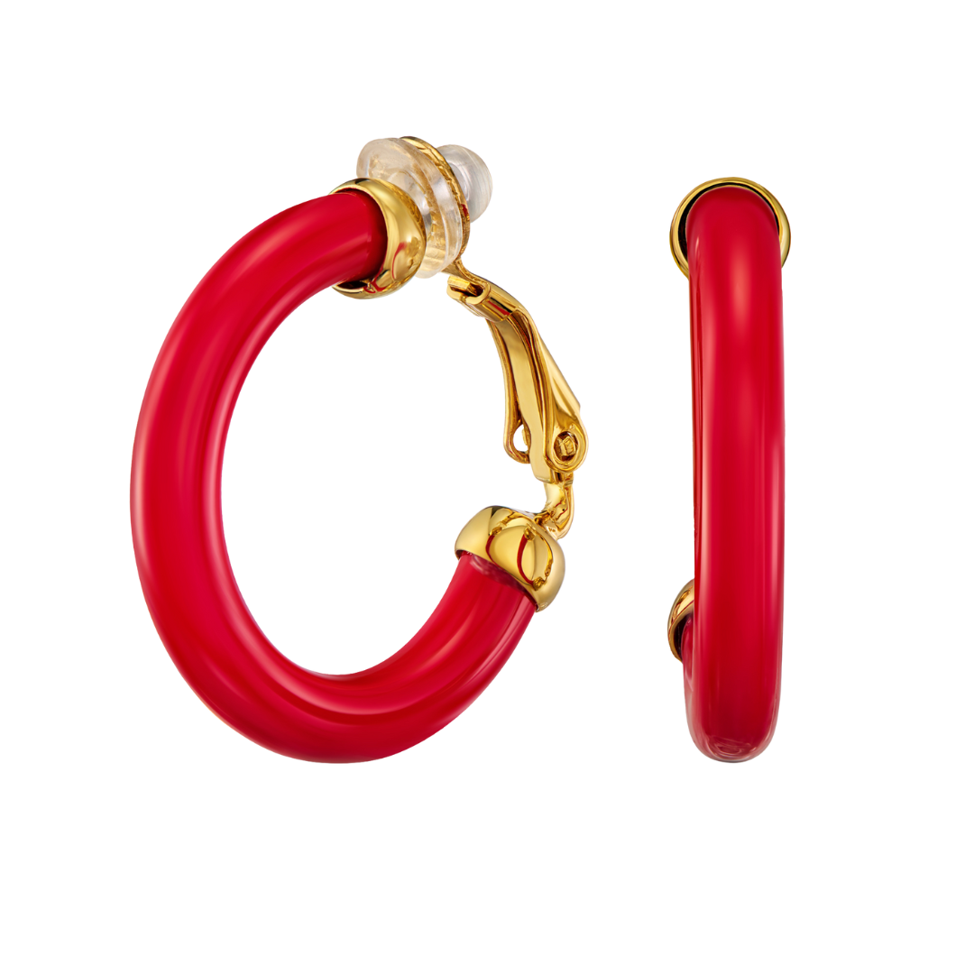 Hoop earrings have been an icon in the fashion world for years! They are stylish, playful and match any outfit. The clip-on earrings are red and the gold coloured parts are fully gold plated with 22 carat gold. The earrings have a diameter of 25 millimetres, a thickness of 4 millimetres and weigh 2 grams each. Thanks to Traveller's unique fastening system, our clip-on earrings are comfortable, light and safe to wear.