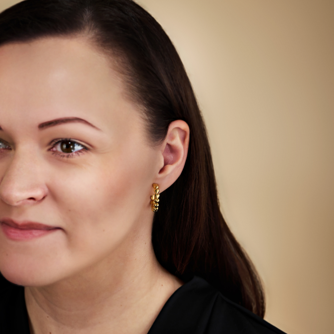 These earrings from Traveller are sweet and playful, these will make everyone happy! The clip-on earrings are in the shape of a hoop made of hearts, they are gold plated with 22 carat gold. The clip-on earrings have a diameter of 24 millimetres and weigh 3.5 grams per earring.