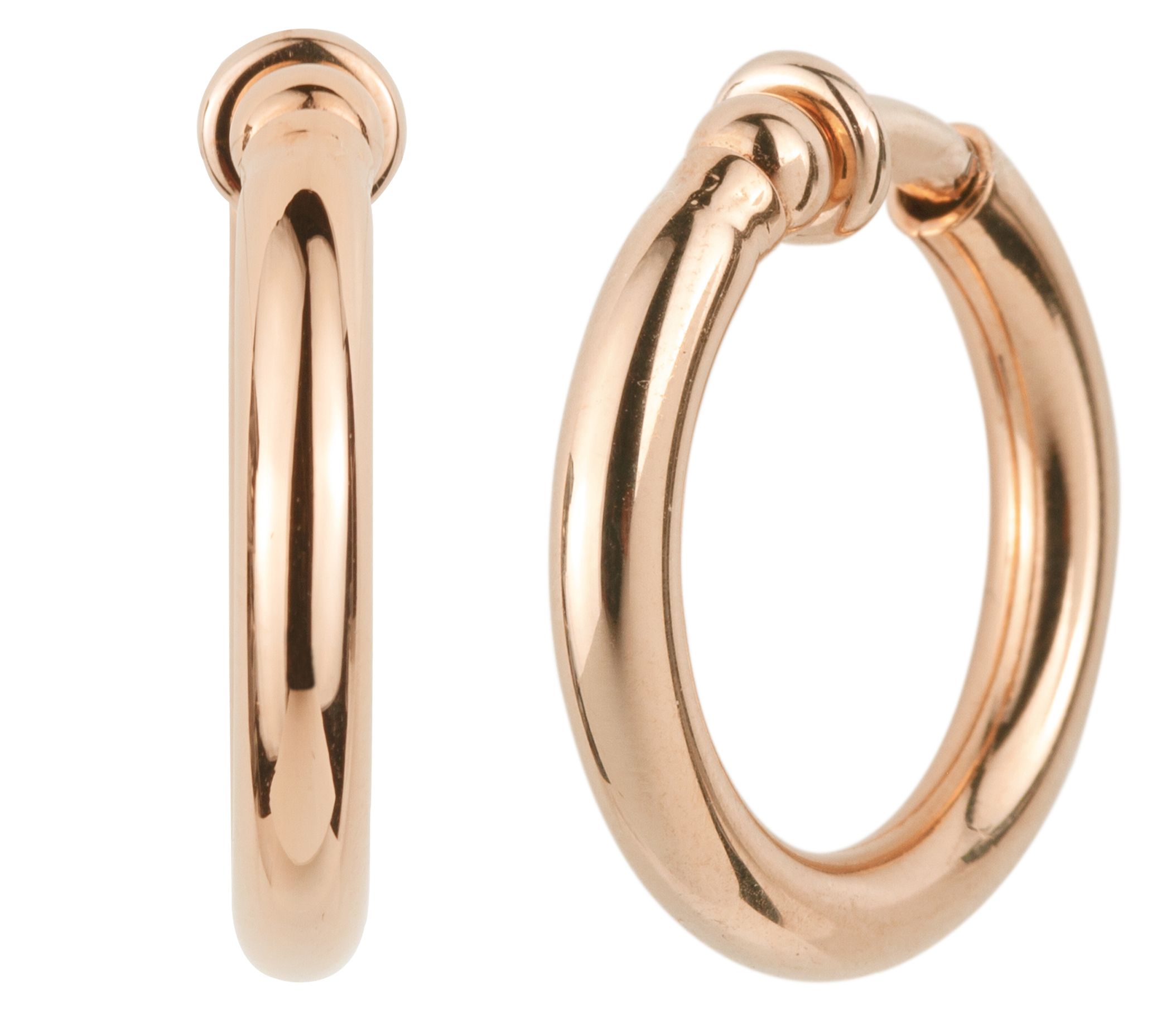 Hoop earrings have been a fashion icon for years! They are stylishly playful and match any outfit. These hoop clip-on earrings from Traveller are specially designed for those without pierced ears. The clips are fully gold plated with 18 carat rose gold (core material: metal), have a diameter of 25 millimetres, a thickness of 4 millimetres and weigh 4 grams each.