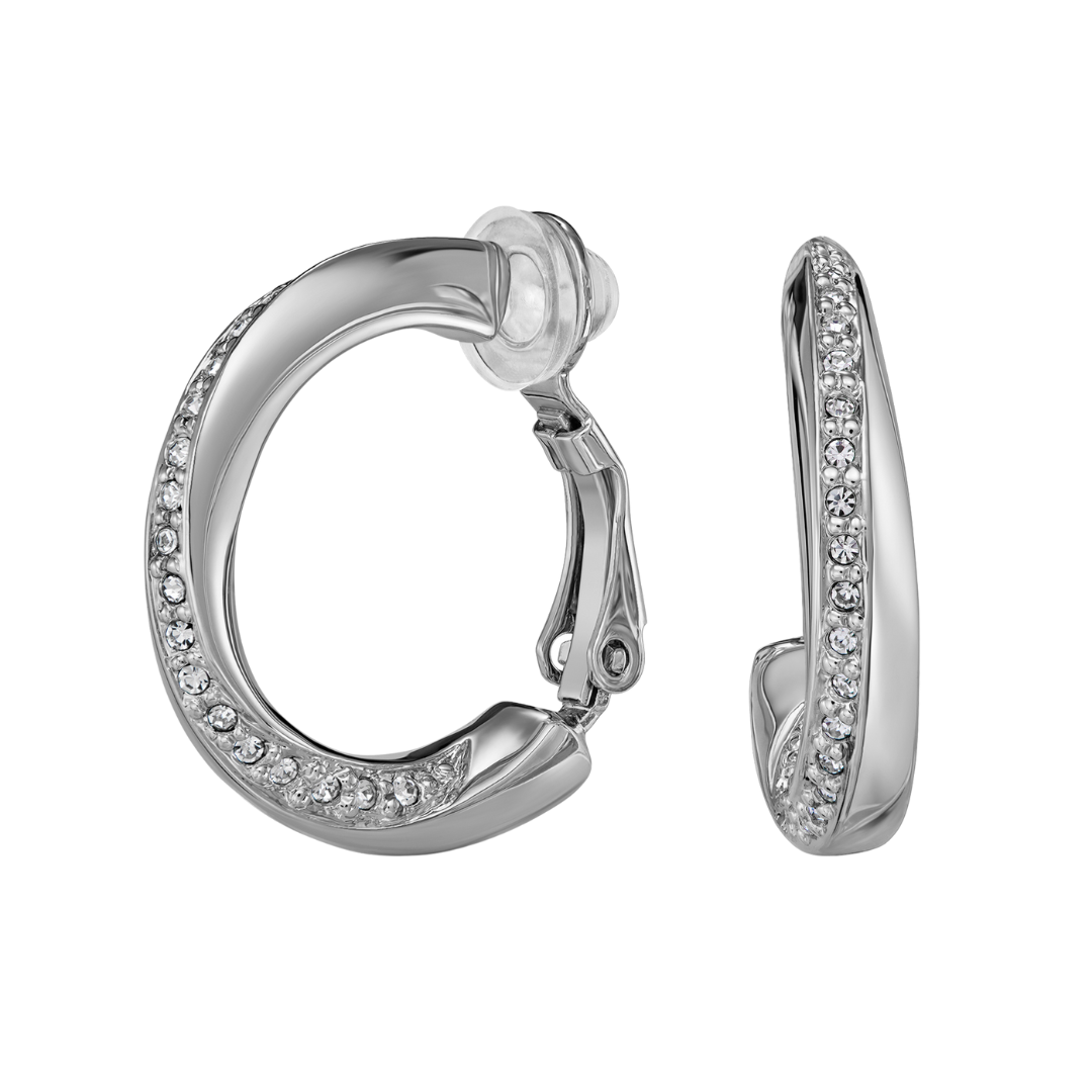 Traveller Clip-on Earrings - Hoops - Silver Coloured - Crystals - Platinum Plated - 20 x 4 mm