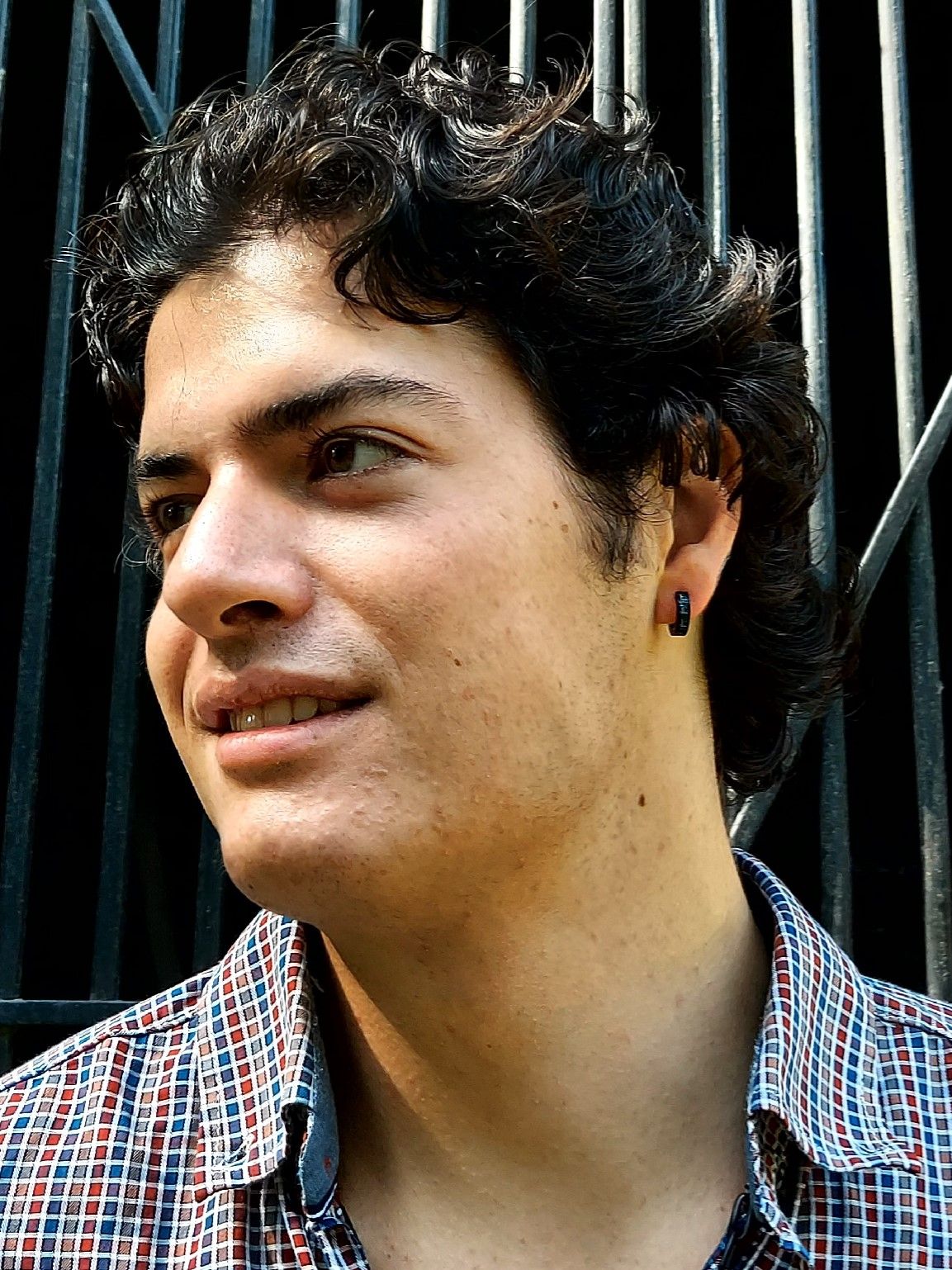 A pair of striking earrings with blue accents from Traveller. The black stainless steel earrings feature a blue patterned design and have a matt finish. The earrings have a diameter of 1 centimetre and weigh just 2 grams each.