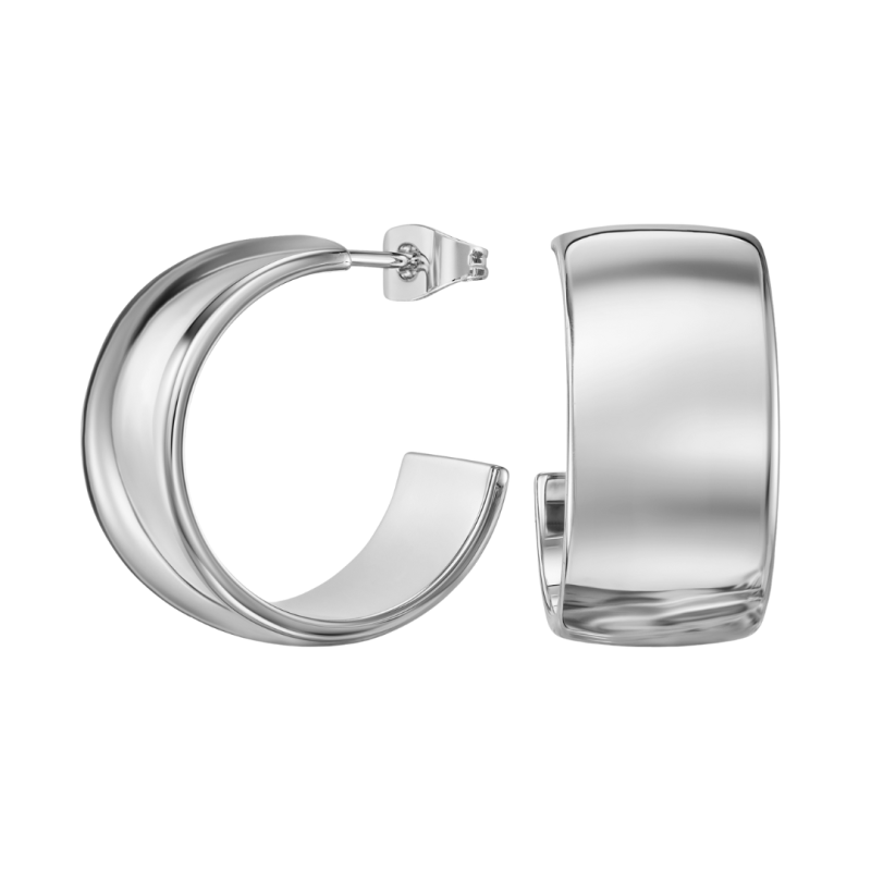 These shiny silver coloured hoop earrings from Traveller have a contemporary look. Hoop earrings have always been in fashion, and this wide version is a beautiful alternative to the classic hoop earring. The palladium plated earrings have a diameter of 22 millimetres, a width of 11 millimetres and weigh 7.3 grams each.