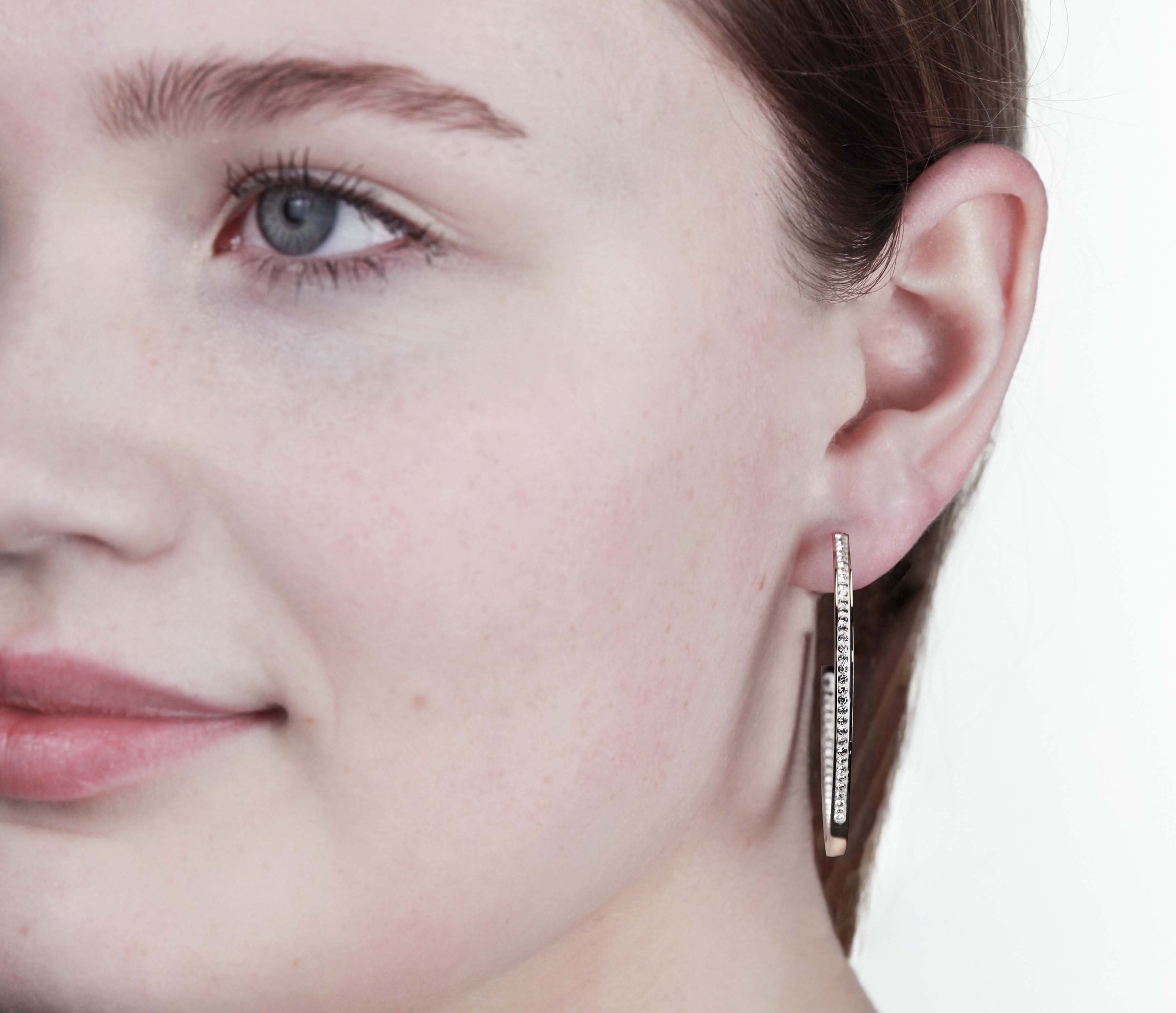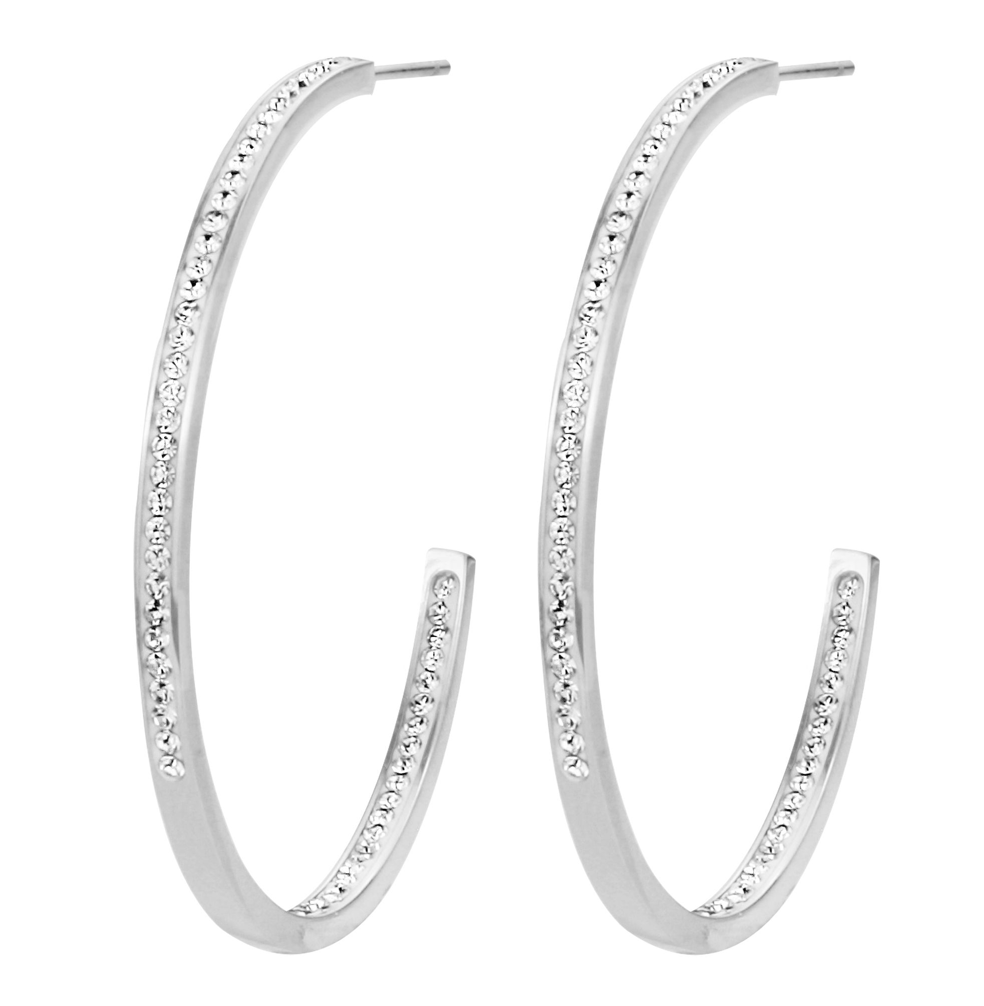 These shiny earrings from Traveller sparkle on your ears. The silver-tone stainless steel earrings are studded with Preciosa crystals. The earrings have a diameter of 40 millimetres and are 2 millimetres wide.