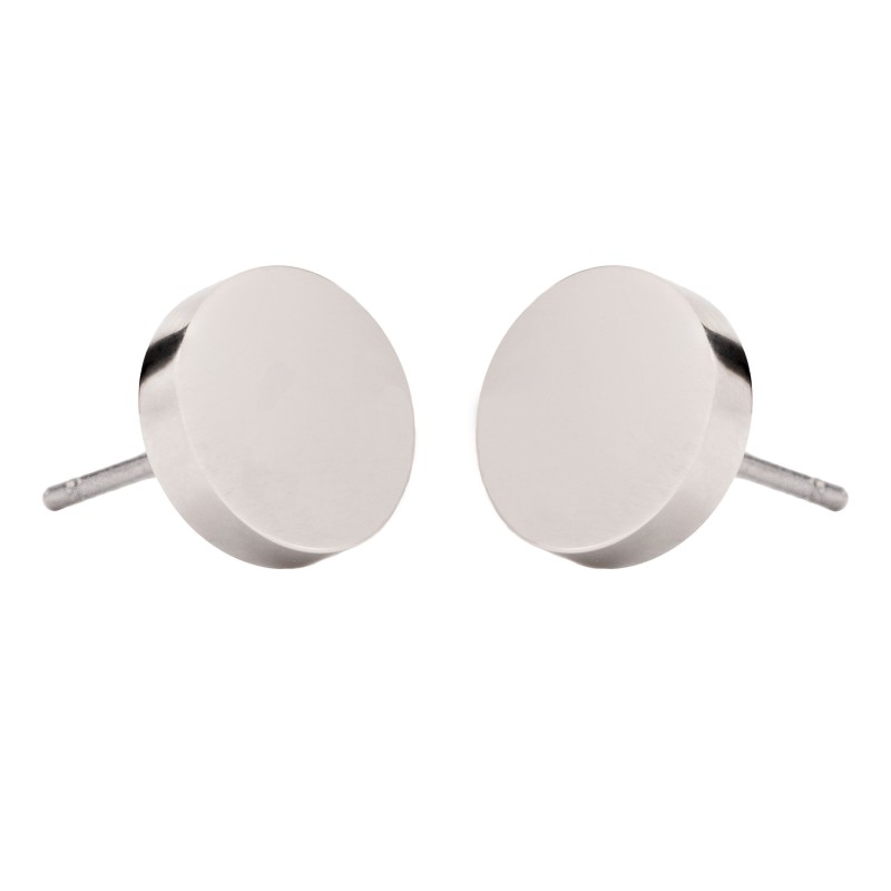 A pair of earrings from Traveller featuring a stylish, timeless design. These shiny silver coloured stainless steel ear studs are in the shape of a circle. The earrings have a diameter of 0.8 centimetres and weigh around 1g each.
