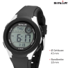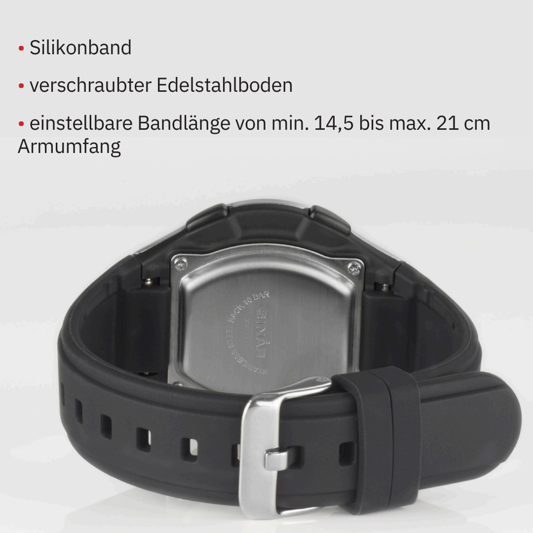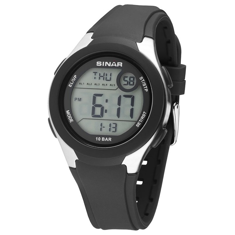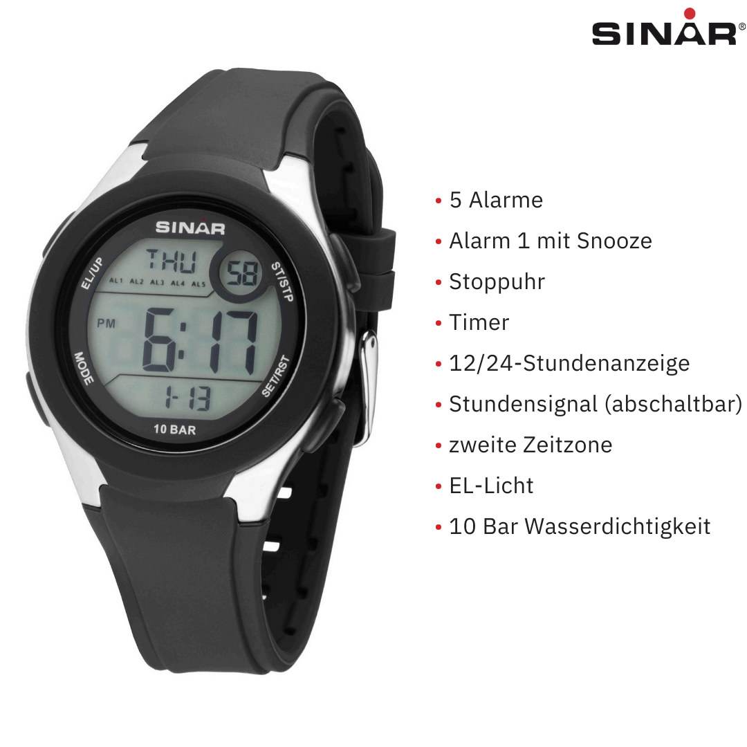 SINAR Digital Watch - Black - Adjustable Strap (14,5-21cm) - 10 Bar - 5 Alarms - Many Functions - 43 mm