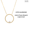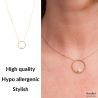 A unique design by Traveller. This gold plated necklace has a pendant with a spherical structure in the shape of a circle containing a genuine freshwater pearl. The pendant has a diameter of 2.5 centimetres and the necklace weighs 4 grams. The stainless steel chain is adjustable, so you can choose the length you want to wear it (45 or 50 centimetres).
