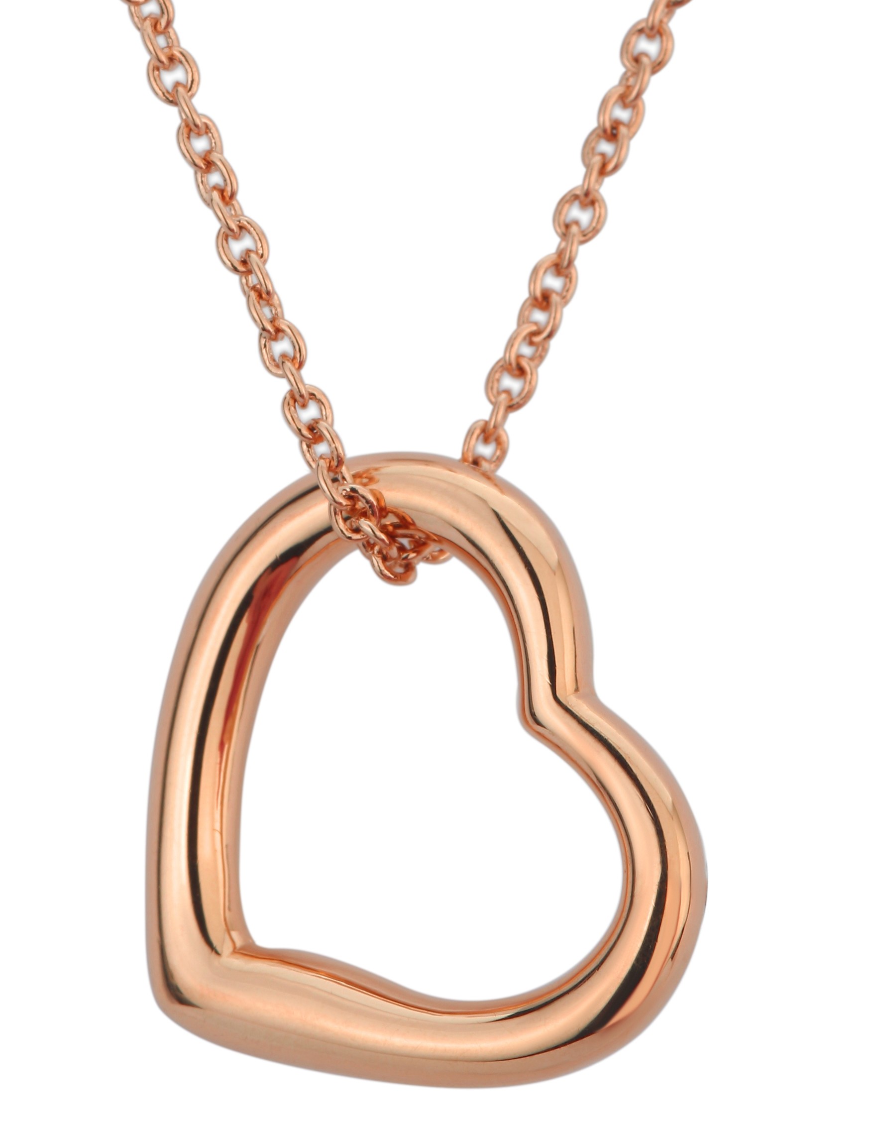 This pendant from Traveller is a uniquely shaped heart that hangs loosely on the chain. Both the pendant and the chain are 18 carat rose gold plated. The heart measures 20 by 24 millimetres and weighs 4 grams. The chain is adjustable with a minimum length of 38 centimetres and can be extended to a maximum length of 44 centimetres with two 3-centimetre extension pieces, so you can decide for yourself how long you want to wear it.