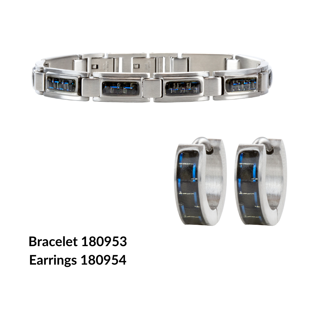 A striking necklace from Traveller featuring a black carbon pendant with blue accents. A stainless steel pendant containing black carbon with blue accents hangs from this stainless steel necklace. A striking necklace but not excessive. The chain has a length of 55 centimetres, the pendant 21 x 12 millimetres. Complete the set with matching bracelet (180953) and earrings (180954).