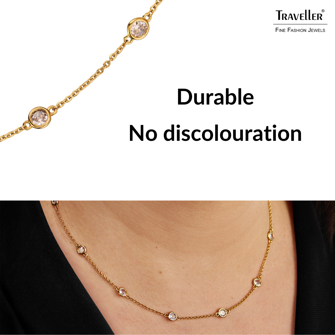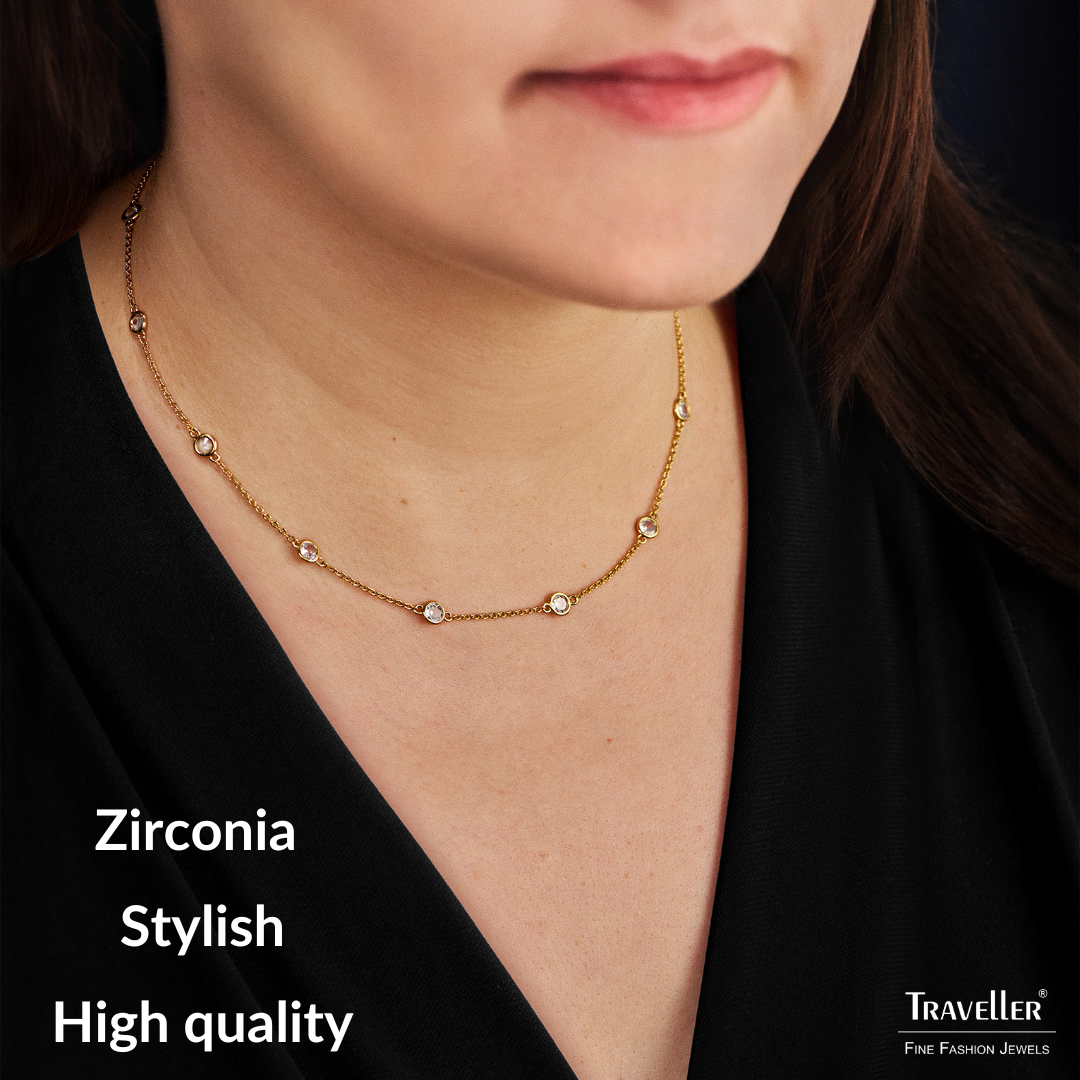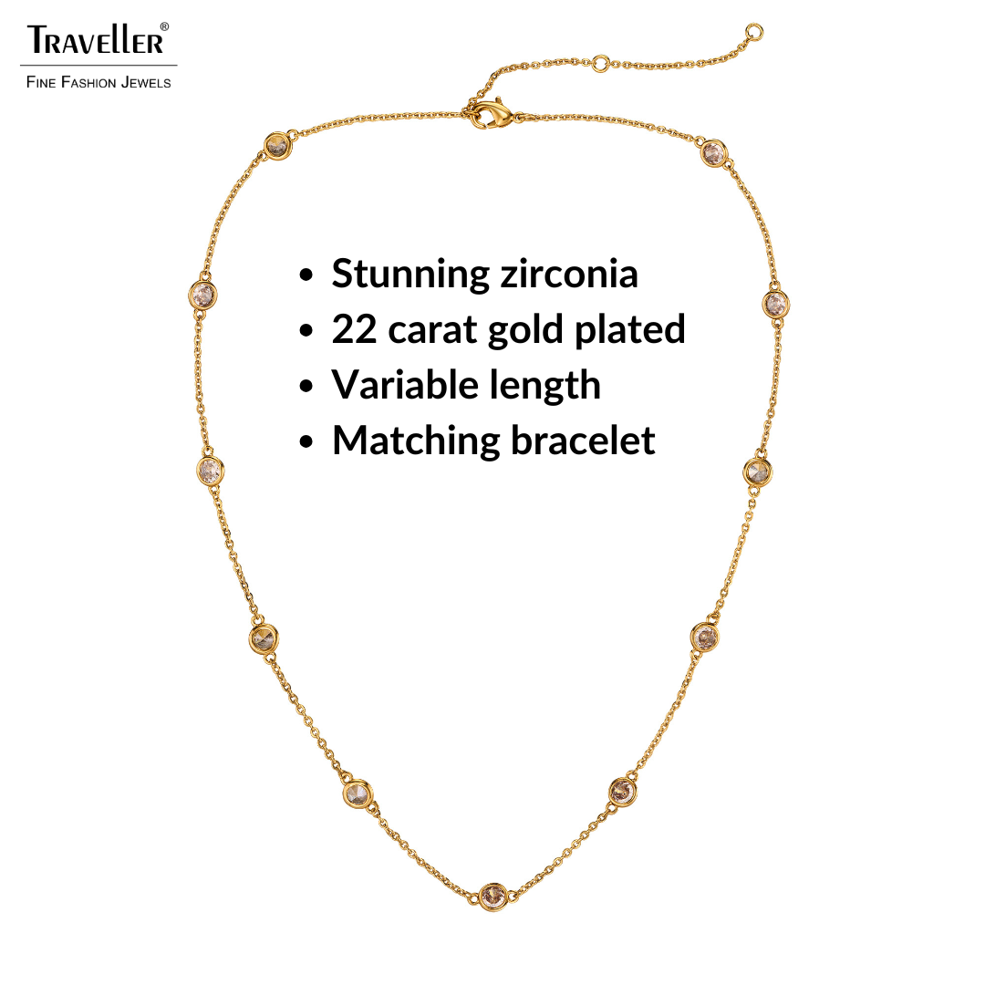 Subtle, classic and radiant. That is what this necklace from Traveller is. The gold coloured necklace is fully gold plated with 22 carat gold and contains 11 beautifully radiant zirconia. The necklace is 38 centimetres long and has 2 extension pieces of 3 centimetres so it can be worn at the desired length, it can therefore be adapted to different clothing styles. The necklace weighs about 3.5 grams. Complete it with the matching bracelet (157760) and drop earrings (157762)!