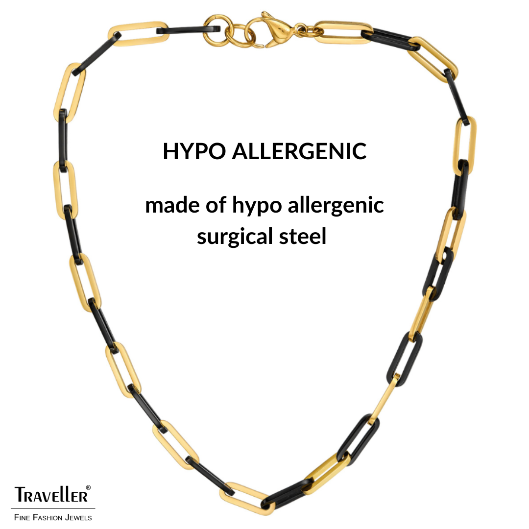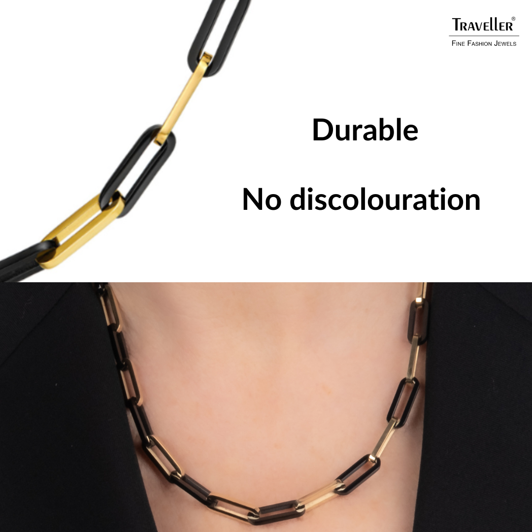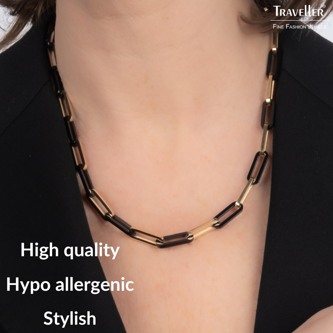 A classy design from Traveller, chic and energetic. The stainless steel chain consists of gold and black coloured links. Alternately, the gold and black coloured links hang from each other. The chain has a length of 47 centimetres, is 0.7 centimetres wide and weighs 35 grams.