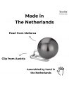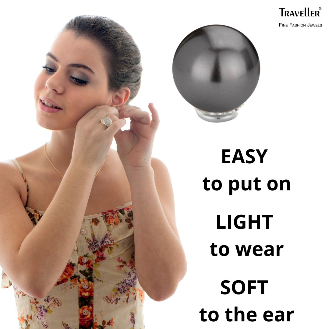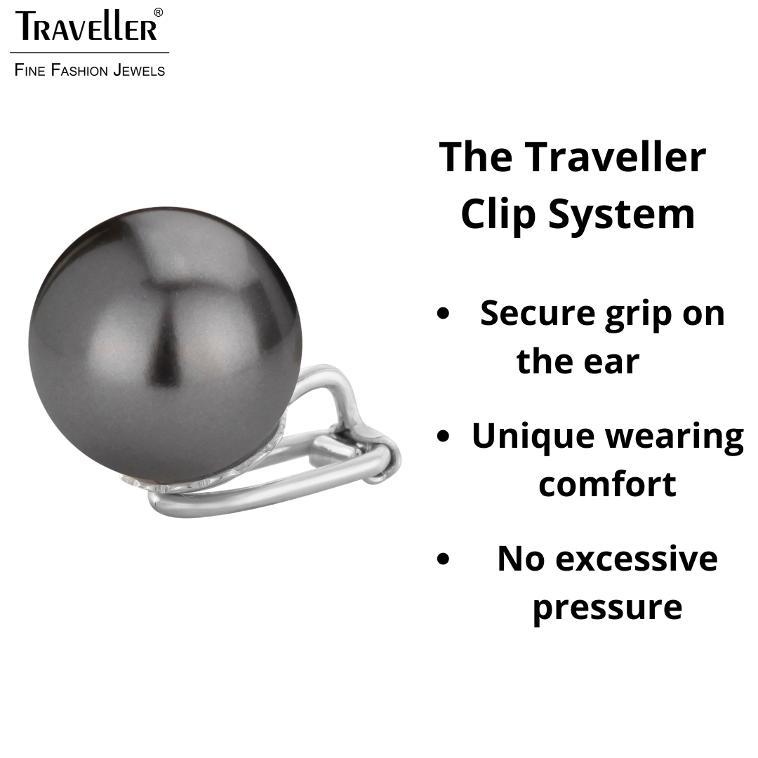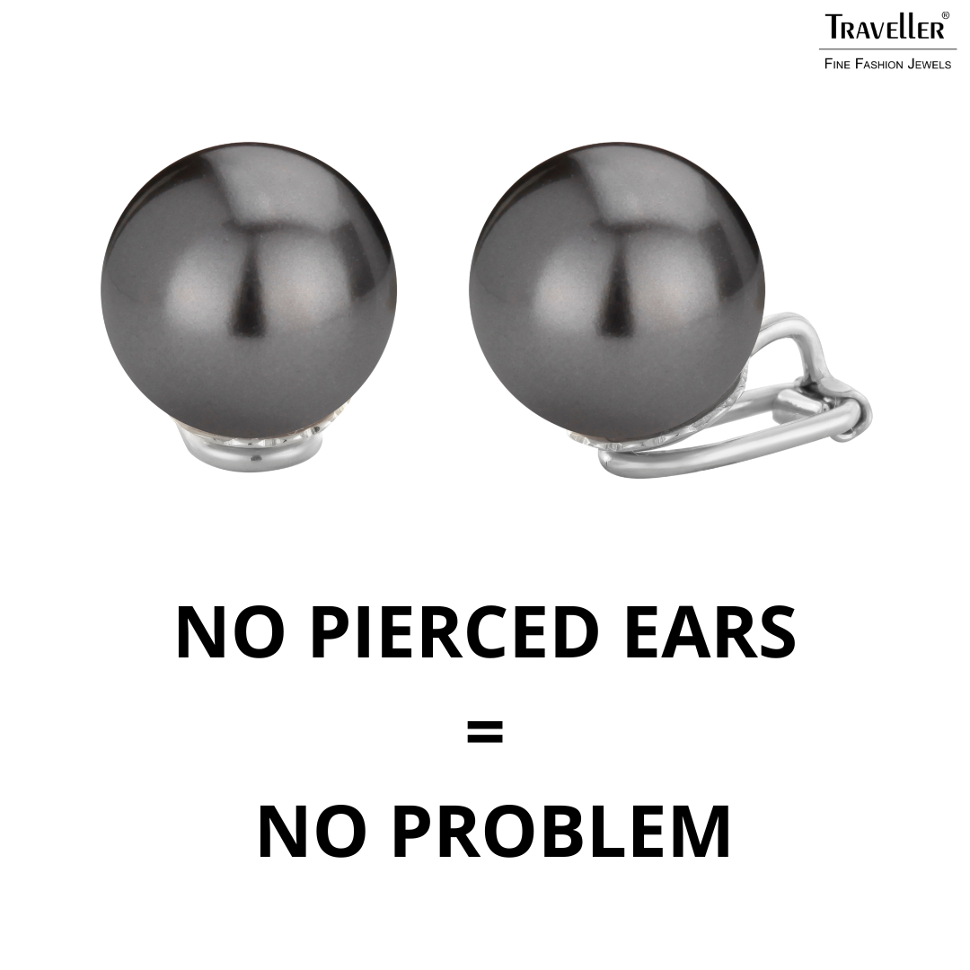 The classic pearl earring in a large version by Traveller with black pearls. This pair of timeless, classy clip-on earrings consists of a fully platinum plated clip topped with a high-quality imitation pearl, sourced from Mallorca - an island renowned for its pearls. The pearls have a diameter of 14 millimetres. Per piece, the clip earrings weigh about 4 grams.
