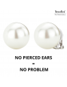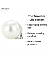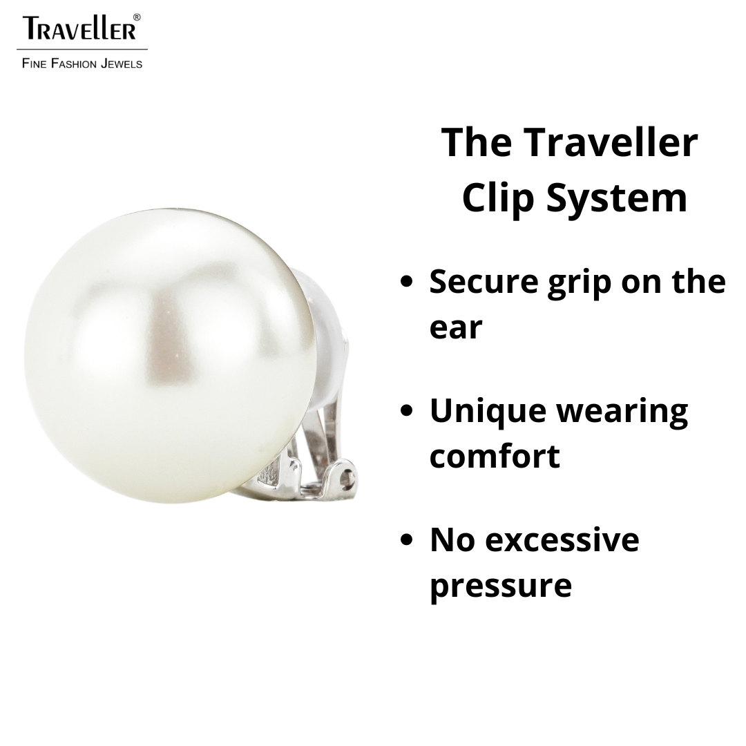 The classic pearl earring stands for beauty and elegance. These plated pearl clip-on earrings from Traveller feature high-quality imitation pearls from Mallorca. The white pearls have a diameter of 20 millimetres. Thanks to Traveller's unique fastening system, these ear clips are very comfortable, light and safe to wear.