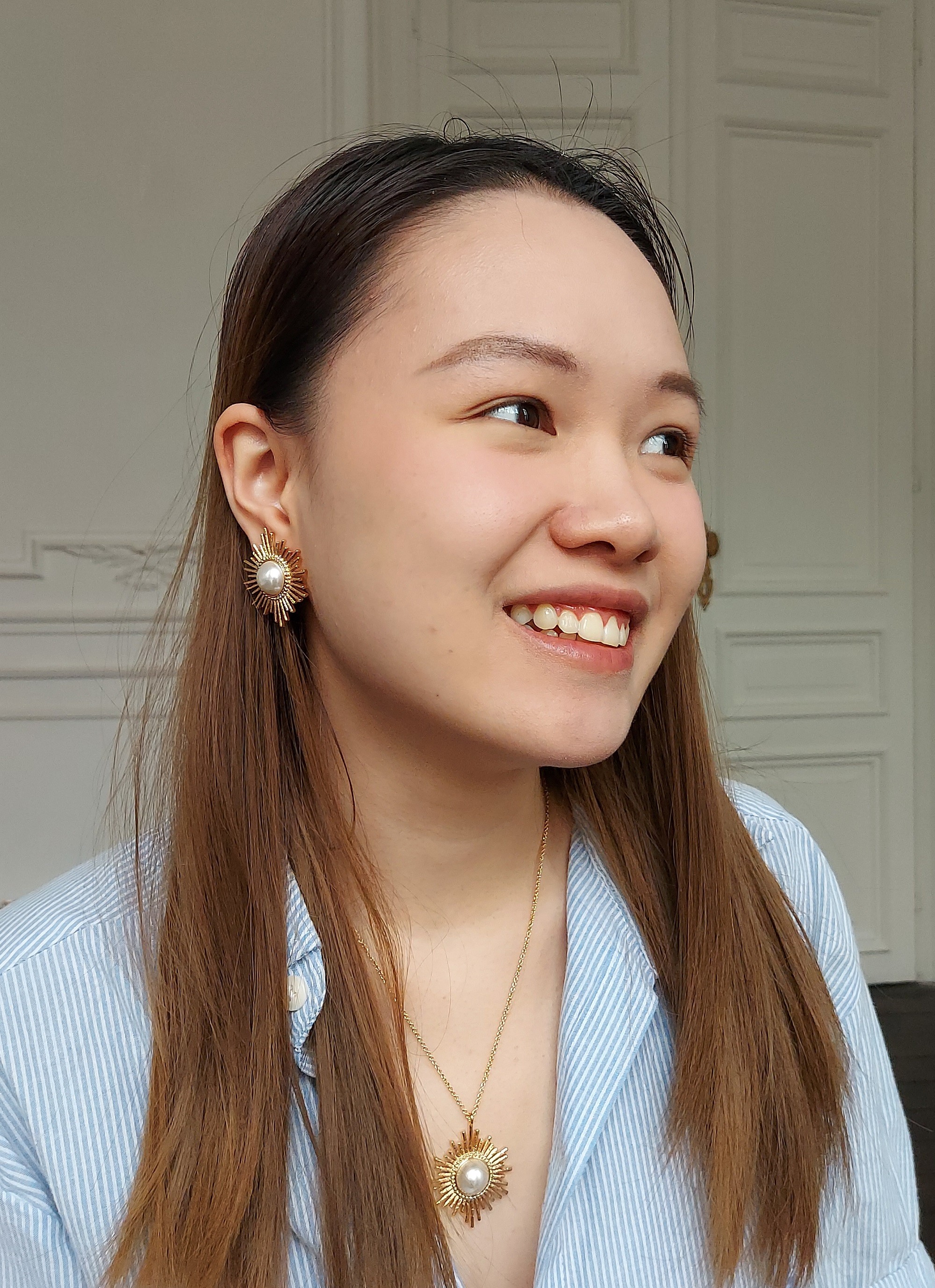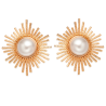 Grossé's Future Floral is a radiant jewellery line with a shiny pearl at its heart. These clip-on earrings are in the shape of futuristic flower with petals shaped like sunbeams. The earrings are fully gold plated 22 carat gold. The gold clip-on earrings measure 3.5 by 3 centimetres and weigh 7.5 grams each.