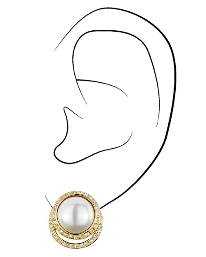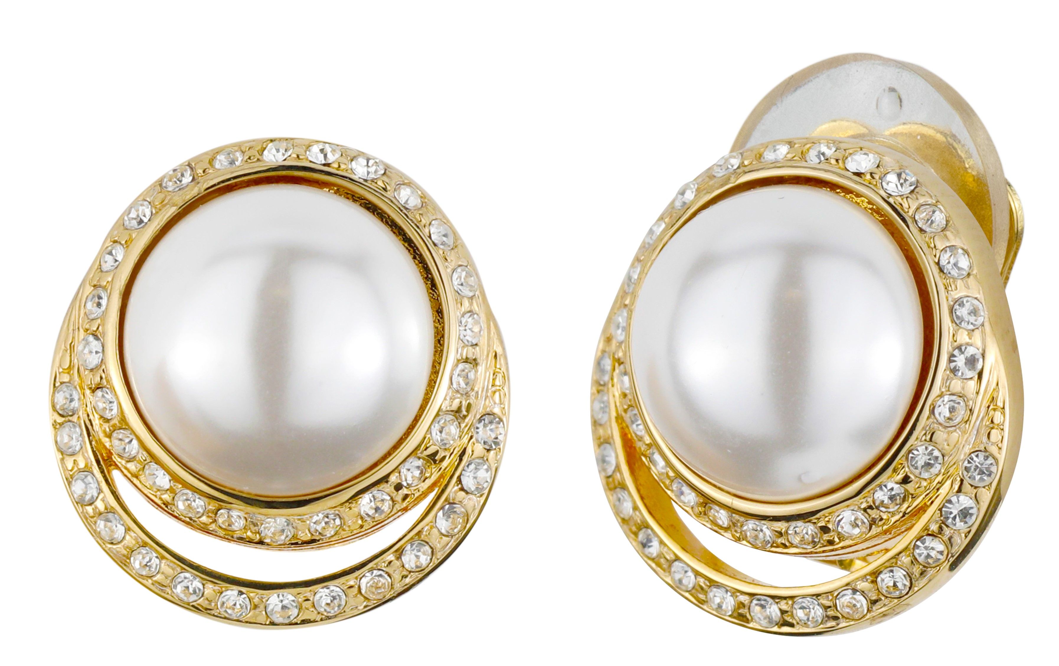 This pair of pearl clip-on earrings from Traveller exudes elegance. The 22 carat gold plated (core material: metal) clips feature a white, high-quality imitation pearl originating from Mallorca - an island known for its pearls. Around it underneath are sparkling rows of Preciosa crystals. In total, the earrings measure 15 x 12 millimetres and weigh 4 grams each. Thanks to Traveller's unique fastening system, these ear clips are very comfortable, light and safe to wear.