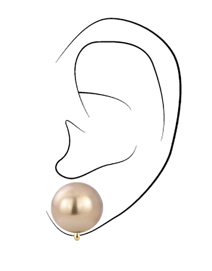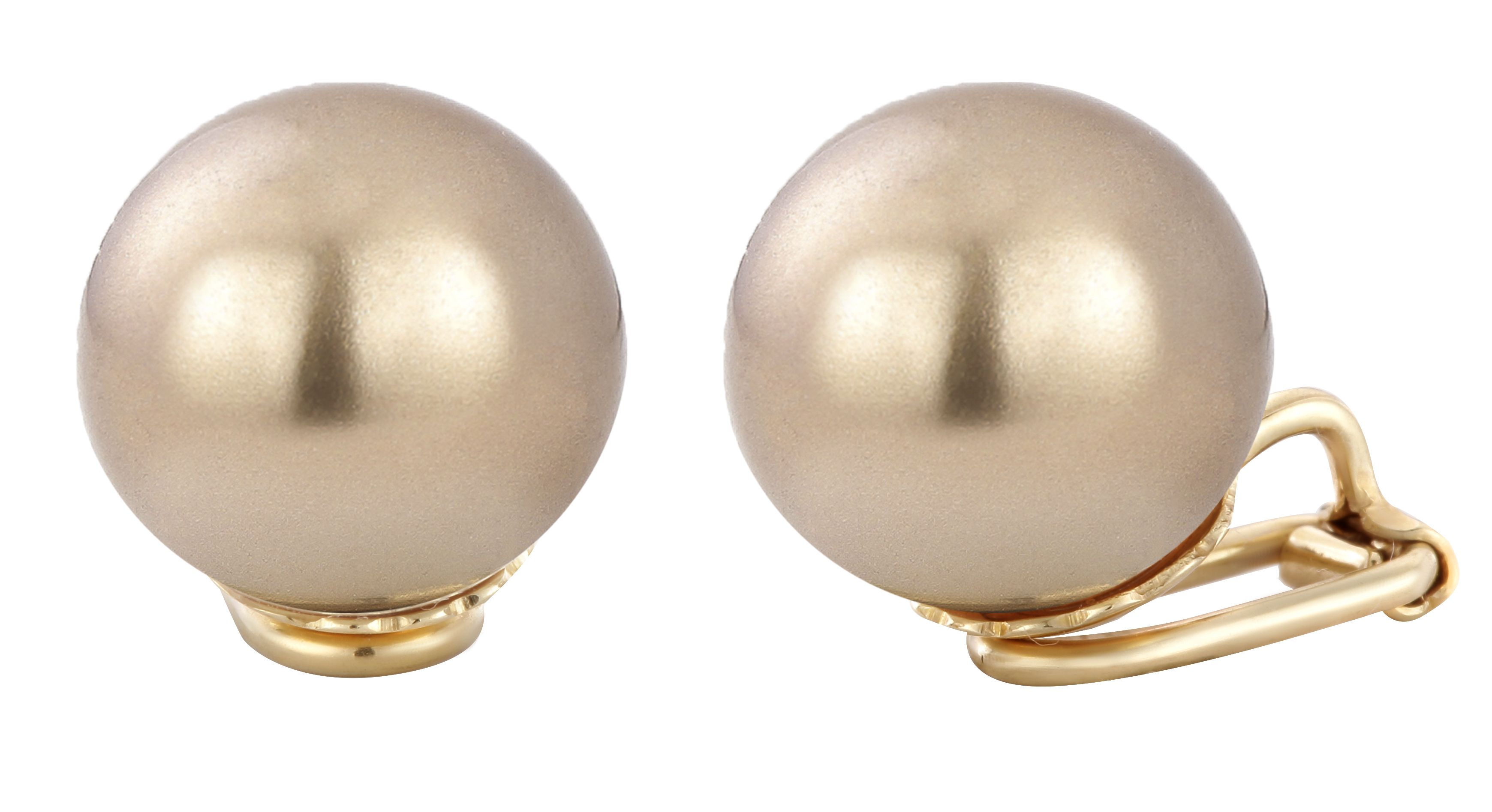 The classic pearl earring in a large clip-on version by Traveller with bronze-coloured pearls. This pair of timeless, classy clip-on earrings consists of a 22 carat gold plated (core material: metal) clip topped with a high-quality imitation pearl, from Mallorca - an island known for its pearls. The pearls have a diameter of 14 millimetres. Per piece, the earrings weigh about 4 grams.