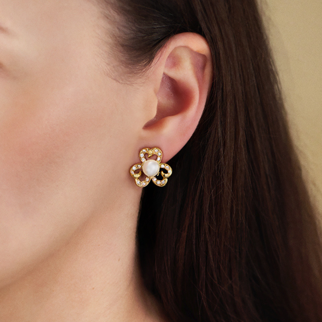 This pair of radiant clip-on earrings from Traveller has a beautiful design: chic and also playful. The white pearl has a diameter of 8 millimetres and forms the heart of a little flower. These high-quality imitation pearls come from Mallorca - an island known for its pearls. The petals of these gold plated 22 carat clip-on earrings are studded with crystals from Preciosa. Per piece, the clip-on earrings weigh 4 grams and thanks to Traveller's unique fastening system, they are very light, comfortable and safe to wear.