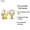 These charismatic clip-on earrings from Traveller have an abstract fantasy shape. The high-quality imitation pearl is encased in a gold coloured frame, beneath which flows an elegant line studded with Preciosa crystals. The pearls come from Mallorca, an island known for its pearls. The earrings are fully plated with 22-carat gold (core material metal) and weigh only 4 grams each. Thanks to Traveller's unique fastening system, our clip-on earrings are very comfortable, light and safe to wear.