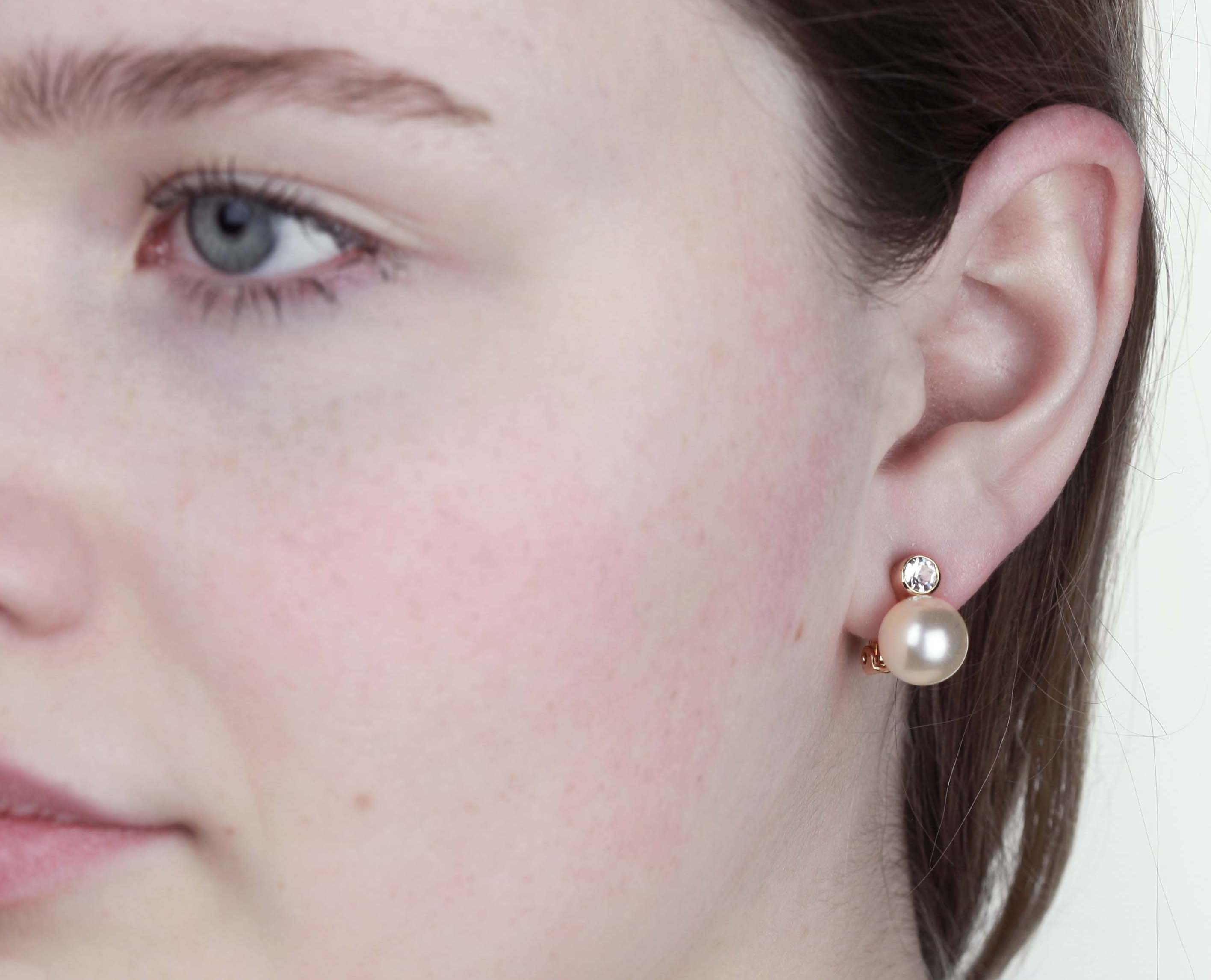 These chic clip-on earrings from Traveller will make you shine. In this design, the classic cream-coloured pearl earring features a sparkling crystal from Preciosa at the top. The high-quality imitation pearls come from Mallorca - an island known for its pearls. The 22-carat gold plated clip-on earrings (core material: metal) measure 15 x 10 millimetres and weigh 3 grams each. Thanks to Traveller's unique fastening system, these ear clips are very comfortable, light and safe to wear.