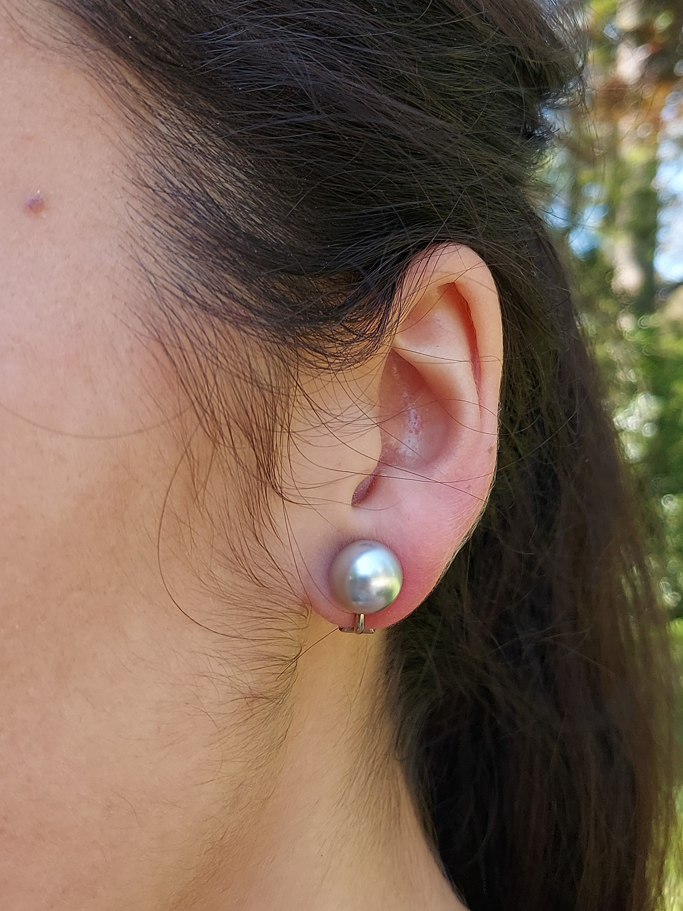 The classic pearl earring stands for beauty and elegance. These platinum plated pearl clip-on earrings from Traveller feature high-quality imitation pearls from Mallorca. The light grey pearls have a diameter of 10 millimetres, the earrings measure 15 x 10 millimetres in total. Thanks to Traveller's unique fastening system, these clip-on earrings are very comfortable, light and safe to wear.