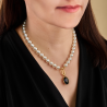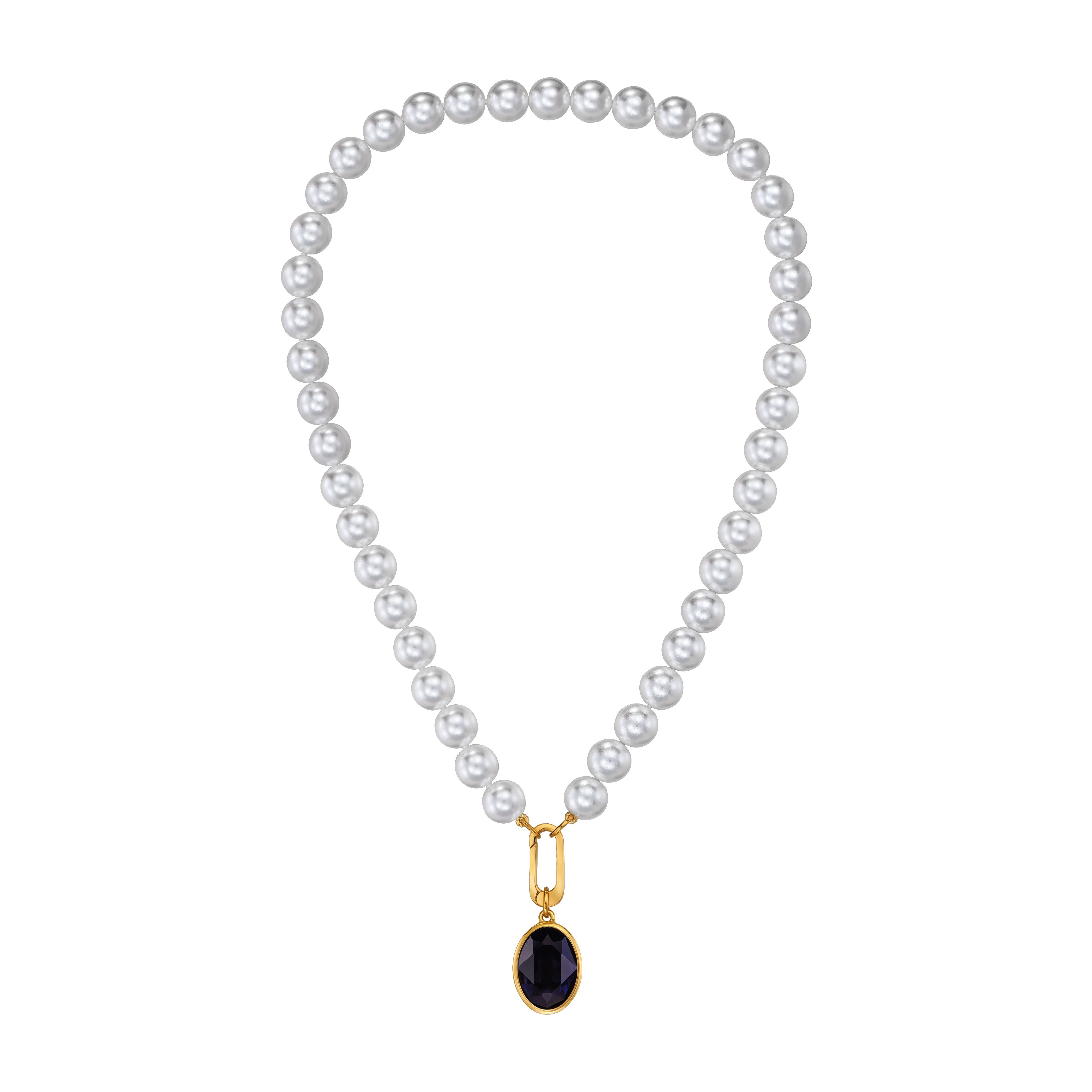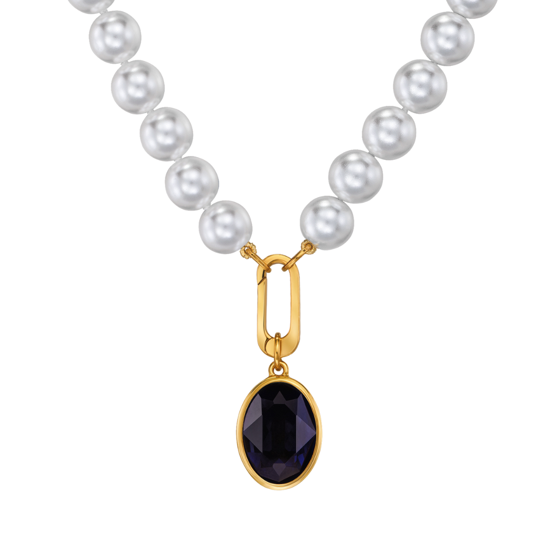 Traveller Pearl Necklace with Pendant - Pearls - 10mm - White - Crystal - Dark Blue - Oval - 45cm - Gold Plated